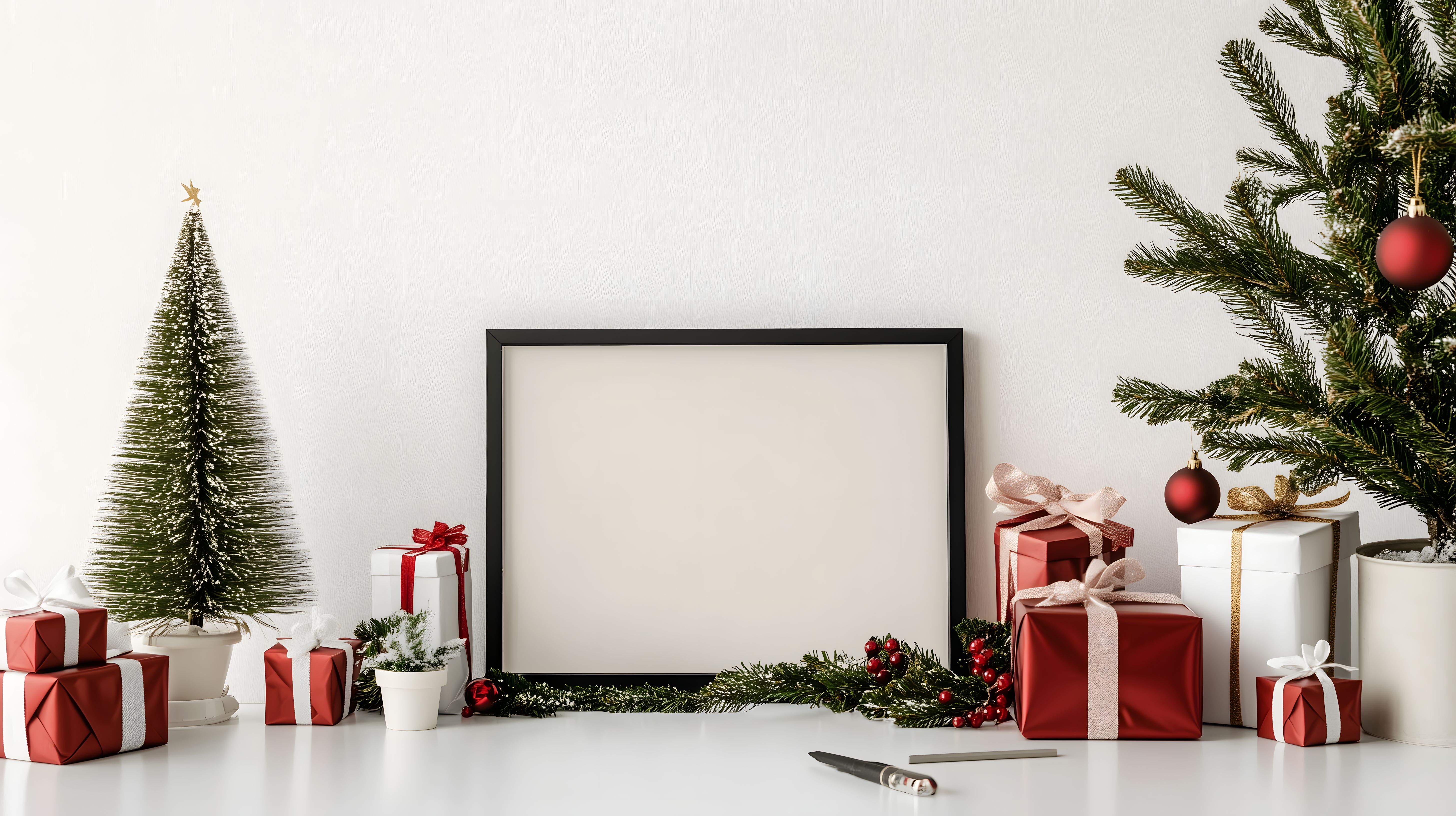 Dieses minimalistisch gestaltete Weihnachtsfoto zeigt eine Anordnung von verschiedenen Dekorationselementen auf weißer Oberfläche. Im Vordergrund sind rote Geschenkboxen, Tannenzweige und eine schwarze Bildhalterung zu sehen. Im Hintergrund befindet sich ein kleiner Weihnachtsbaum. Die Komposition wirkt aufgeräumt und reduziert, setzt aber durch die stimmungsvollen Farbtöne und Materialien Akzente. Dieses Bild eignet sich perfekt für Weihnachtsgrüße, Blog-Beiträge, Newsletter-Designs oder Produktpräsentationen in der Weihnachtszeit. Als hochwertiges, kostenloses Stockfoto unter Creative-Commons-Lizenz steht es für eine Vielzahl an Einsatzmöglichkeiten zur Verfügung.