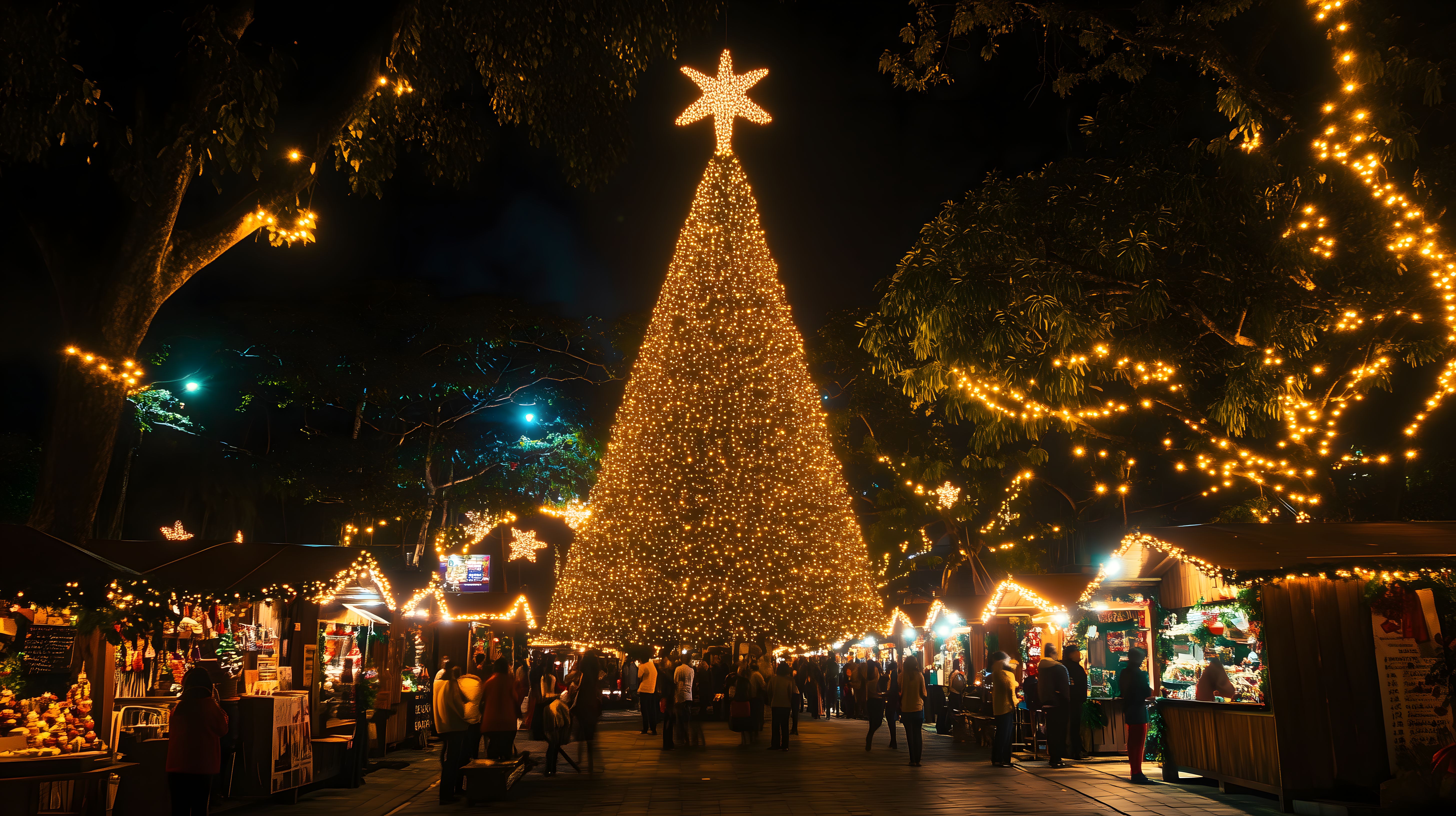 Dieses stimmungsvolle Foto zeigt einen festlich beleuchteten Weihnachtsmarkt bei Nacht. Im Zentrum des Bildes steht ein riesiger, glitzernder Weihnachtsbaum, der mit unzähligen Lichtern geschmückt ist und von einem erleuchteten Stern gekrönt wird. Rund um den Baum sind bunte Verkaufsstände und kleine Buden zu sehen, die weihnachtliche Waren und Leckereien anbieten. Die Besucher des Marktes sind in der warmen, stimmungsvollen Beleuchtung zu erkennen. Die Szenerie strahlt eine gemütliche, festliche Atmosphäre aus und eignet sich hervorragend als kostenloses Stockfoto für Weihnachts-Blogbeiträge, Newsletter oder Werbematerialien in hoher Auflösung unter einer Creative-Commons-Lizenz.