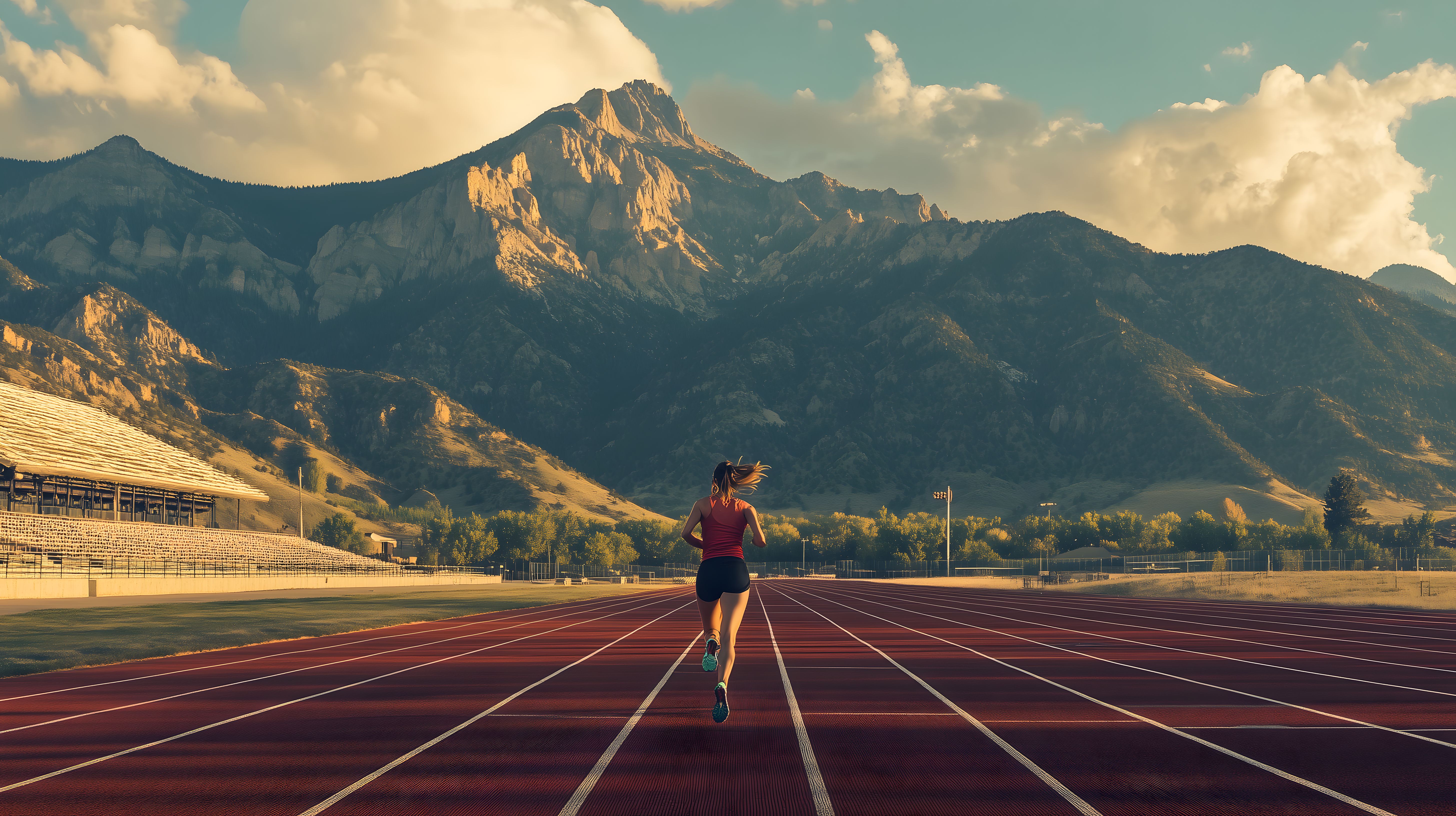 Das Bild zeigt eine Läuferin, die auf einer Rennbahn vor einer beeindruckenden Berglandschaft läuft. Die Sonne scheint von der Seite und wirft lange Schatten auf die rote Laufbahn. Im Hintergrund erheben sich majestätische Bergketten mit schroffem Gipfel, die vom warmen Licht des Sonnenaufgangs angestrahlt werden. Der Kontrast zwischen der dynamischen Bewegung der Läuferin und der ruhigen, monumentalen Bergkulisse ist faszinierend. Dieses Stockfoto in hoher Auflösung ist perfekt geeignet für die Verwendung in Blogs, Newslettern, Social-Media-Beiträgen oder Werbematerialien zum Thema Sport, Fitness und Outdoor-Aktivitäten. Es steht unter einer Creative-Commons-Lizenz zur kostenlosen Nutzung zur Verfügung.