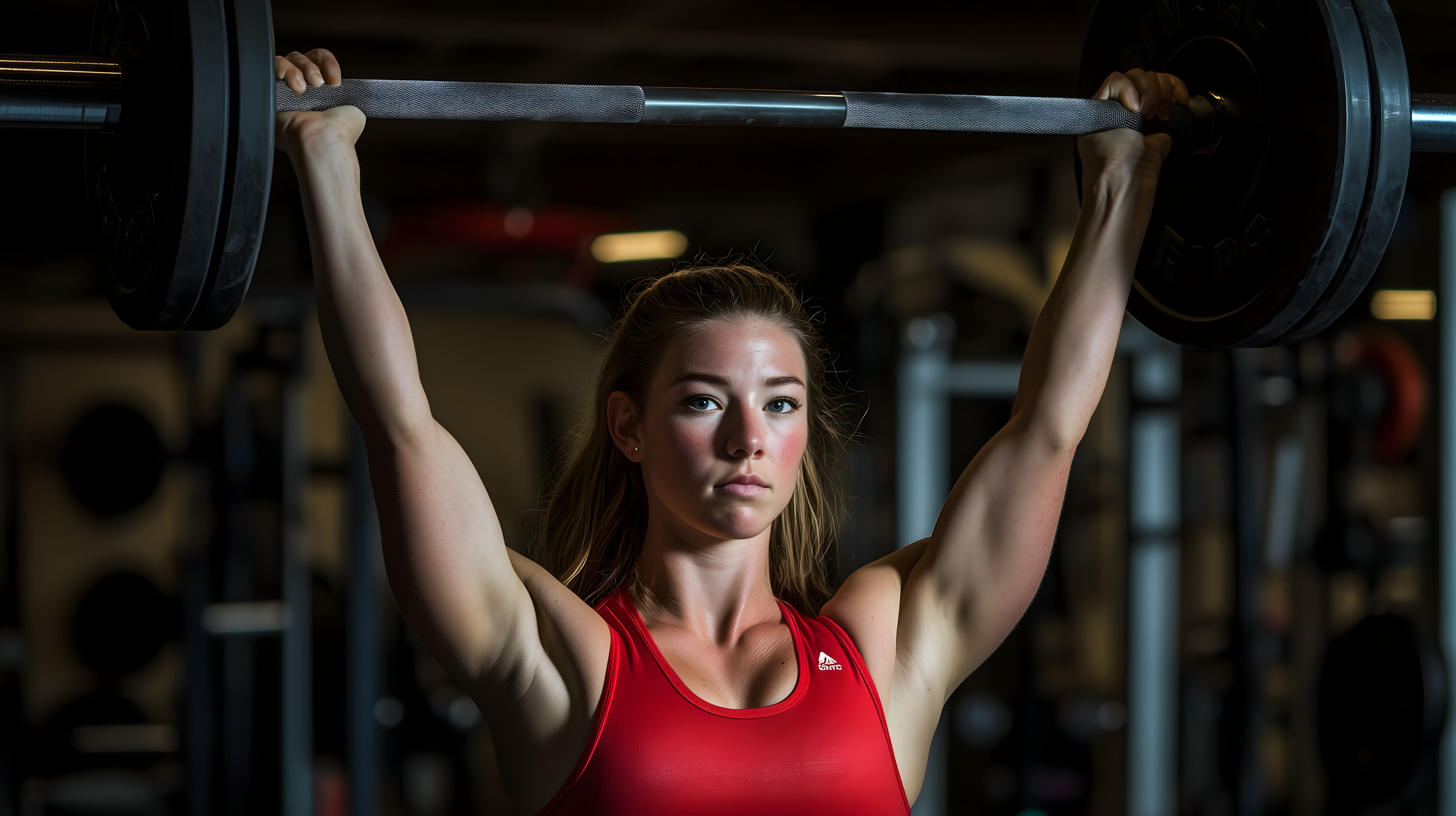 Das Bild zeigt eine junge, kräftig gebaute Frau, die eine schwere Hantel in die Höhe stemmt. Sie trägt ein rotes Sporttop und blickt konzentriert nach vorne. Der Hintergrund ist dunkel, wodurch der Fokus ganz auf der Athletin und ihrer Leistung liegt. Das Foto eignet sich perfekt für Beiträge zu Themen wie Fitness, Sport, Gesundheit und Leistungsbereitschaft. Es vermittelt Stärke, Ausdauer und Motivation. Als hochwertiges Stockfoto in hoher Auflösung kann es kostenlos und unter Creative-Commons-Lizenz für Blog-Artikel, Social-Media-Posts, Werbematerialien und vieles mehr verwendet werden.