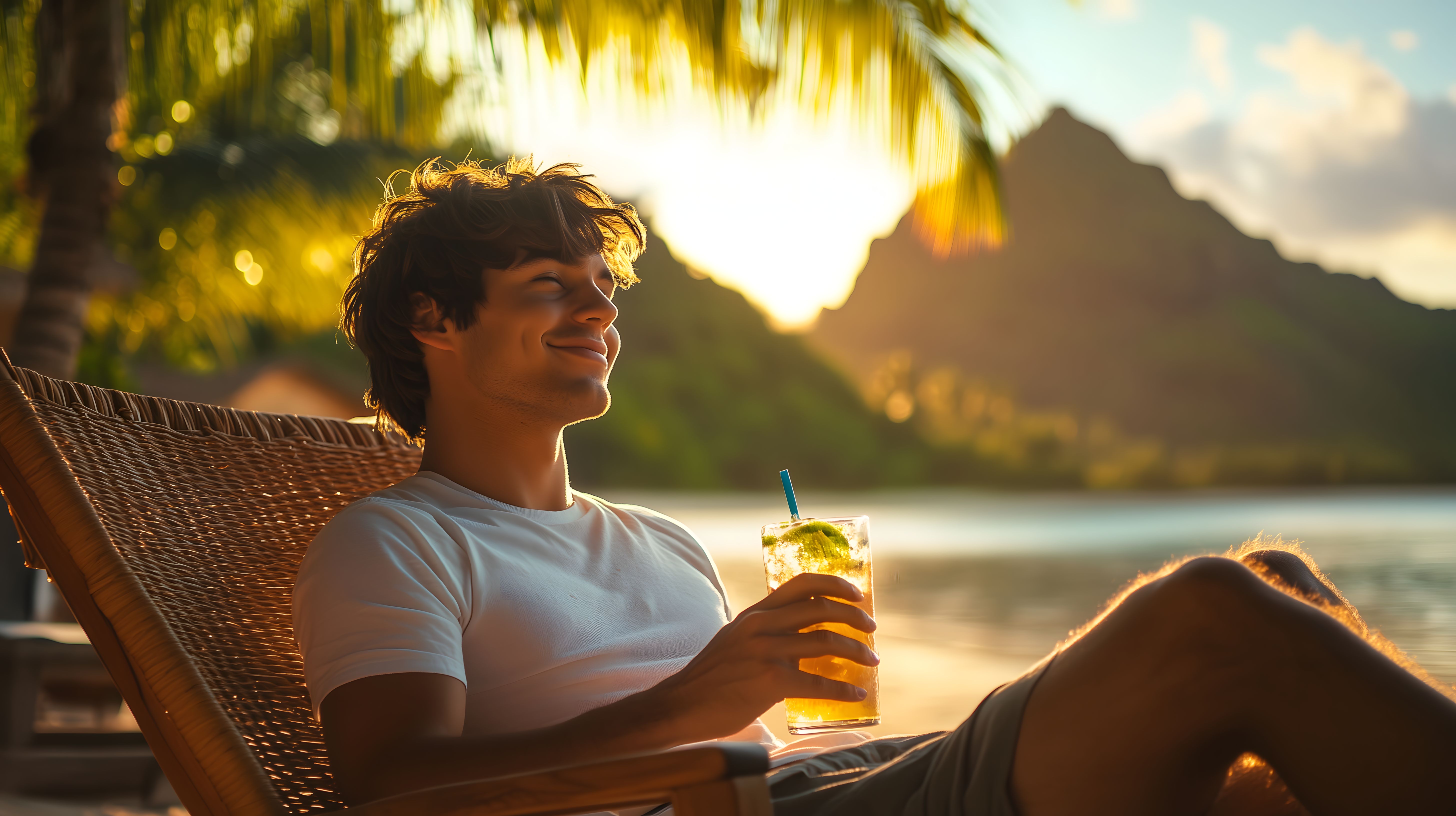 Dieses Foto zeigt einen jungen Mann, der an einem tropischen Strand sitzt und einen erfrischenden Cocktail genießt, während er den atemberaubenden Sonnenuntergang über dem Wasser beobachtet. Die Szenerie ist geprägt von üppiger Vegetation, wie Palmen, und einer ruhigen, idyllischen Atmosphäre. Das Bild vermittelt ein Gefühl von Entspannung und Erholung, das perfekt für die Verwendung in Reiseblogs, Werbekampagnen oder Sommerreisen geeignet ist. Das hochauflösende Stockfoto ist kostenfrei unter einer Creative-Commons-Lizenz verfügbar.