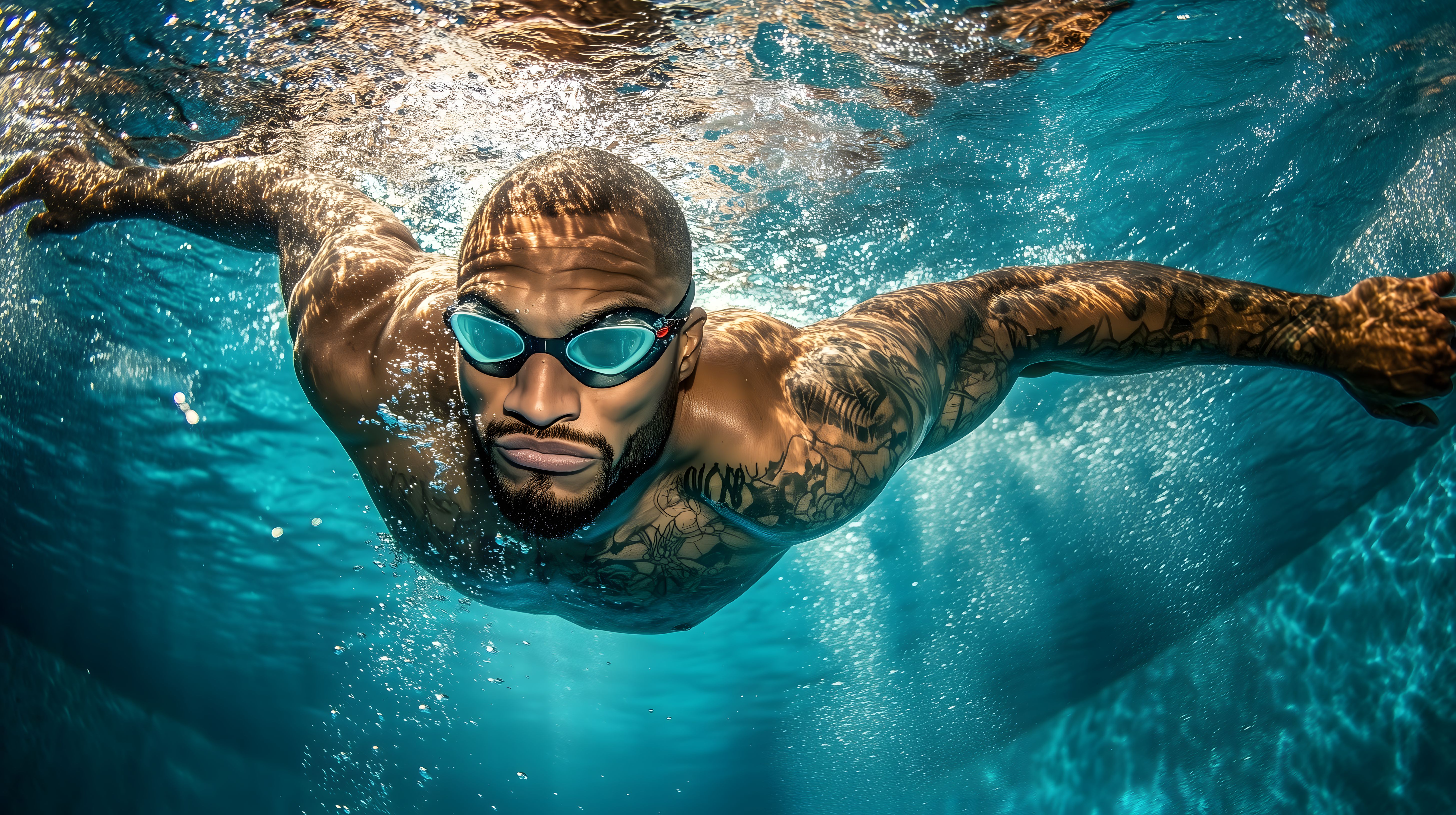 Das Bild zeigt einen muskulösen Mann, der konzentriert durchs klare, türkisfarbene Wasser schwimmt. Er ist mit Schwimmbrille und ohne Oberkörperbekleidung zu sehen, wobei seine Tätowierungen deutlich sichtbar sind. Der Spritzeffekt und die Unterwasserperspektive verleihen dem Foto eine dynamische und faszinierende Optik. Dieses Stockfoto eignet sich hervorragend für Blogs, Websites oder Werbekampagnen rund um Themen wie Fitness, Wassersport, Outdoor-Aktivitäten oder einen gesunden, aktiven Lebensstil. Die hohe Auflösung und Creative-Commons-Lizenz machen es zu einem kostenlosen, vielseitig nutzbaren Bildmotiv.