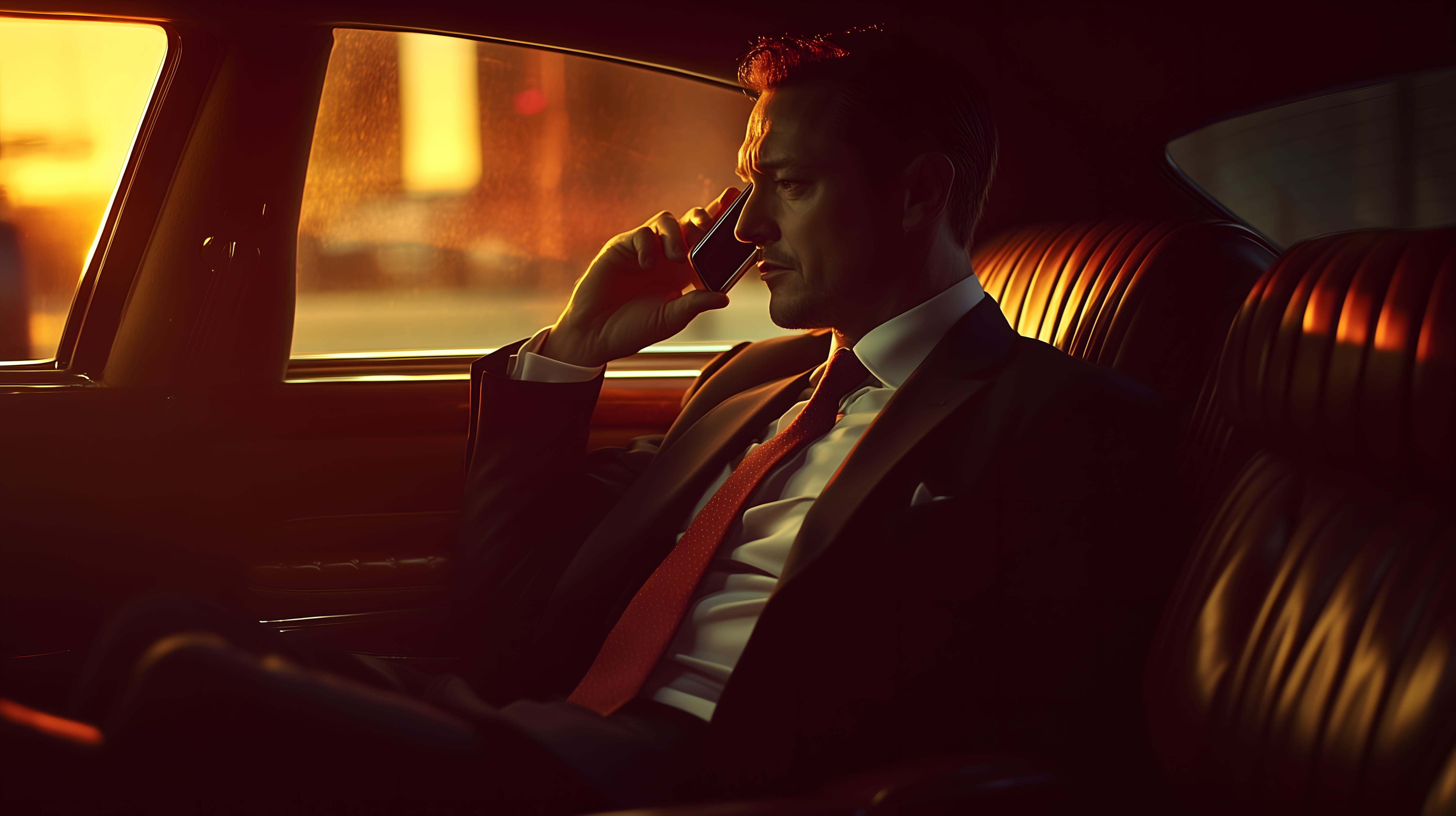 Das Bild zeigt einen Geschäftsmann, der in einem Fahrzeugrücksitz telefoniert, während die Sonne untergeht. Die warme, goldene Beleuchtung taucht den Fahrgastraum in ein stimmungsvolles Licht und erzeugt einen eleganten, luxuriösen Eindruck. Der Mann in seinem Anzug wirkt konzentriert und professionell, während er vermutlich in einem wichtigen Geschäftsgespräch ist. Dieses Foto wäre ideal für den Einsatz in Blogbeiträgen, Newslettern oder Werbekampagnen rund um Themen wie Mobilität, Geschäftsreisen, Business-Lifestyle oder Kommunikation. Als hochauflösendes, frei verwendbares Stockfoto unter der Creative-Commons-Lizenz ist es eine attraktive visuelle Ergänzung für diverse Einsatzzwecke.