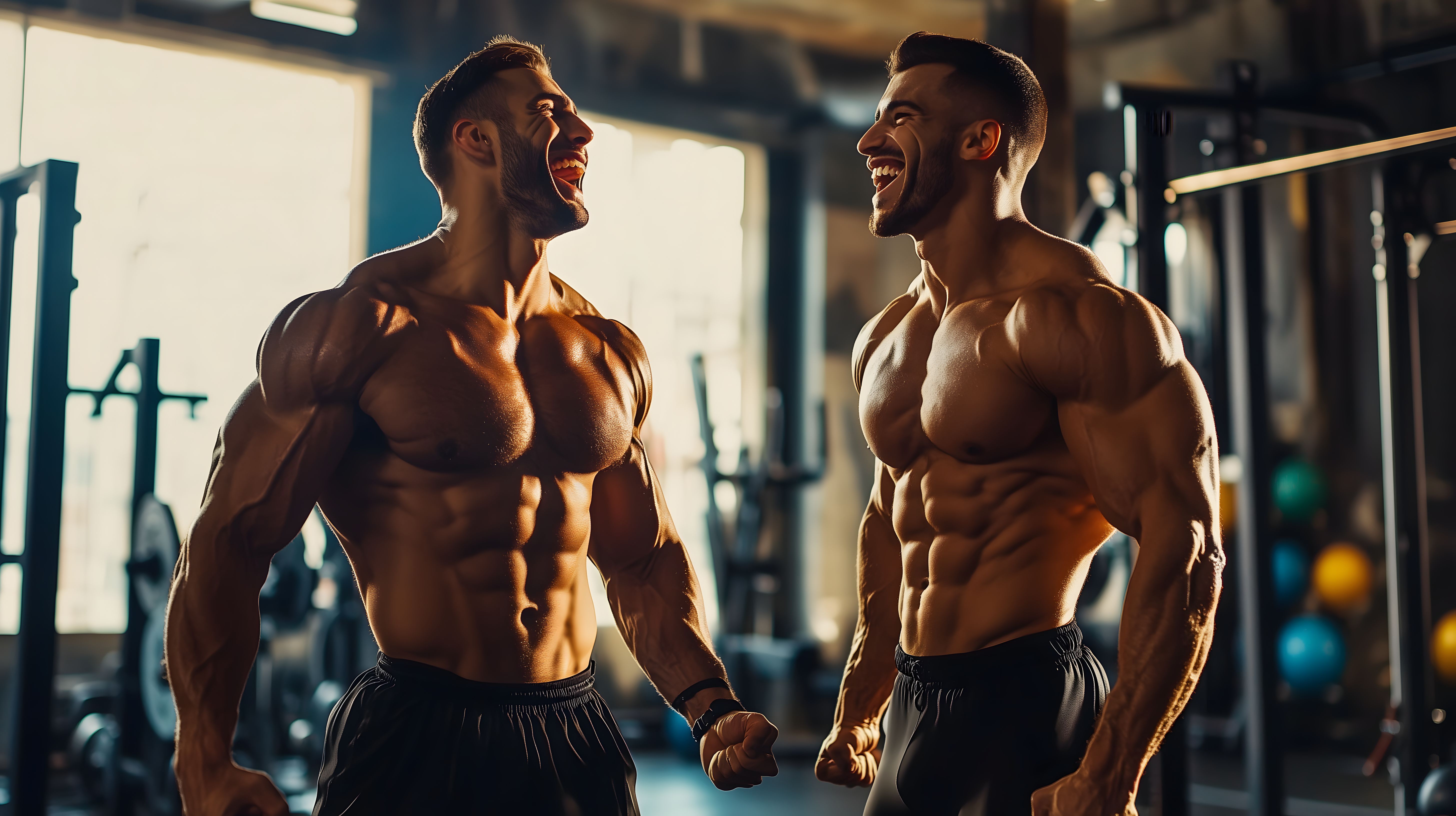 Das Foto zeigt zwei trainierte Männer, die lachend und fröhlich in einem Fitnessstudio trainieren. Ihre durchtrainierten Körper und Muskeln sind deutlich sichtbar, was ihre Leidenschaft für Fitness und Bodybuilding widerspiegelt. Die Szene vermittelt eine positive Stimmung und Energie, die Fitnesstraining und einen gesunden Lebensstil ausstrahlt. Dieses hochaufgelöste, kostenlose Stockfoto eignet sich hervorragend für Beiträge in Blogs, Newslettern oder Social-Media-Kanälen rund um Themen wie Gesundheit, Lifestyle und Sport. Es steht unter der Creative-Commons-Lizenz zur freien Nutzung zur Verfügung.