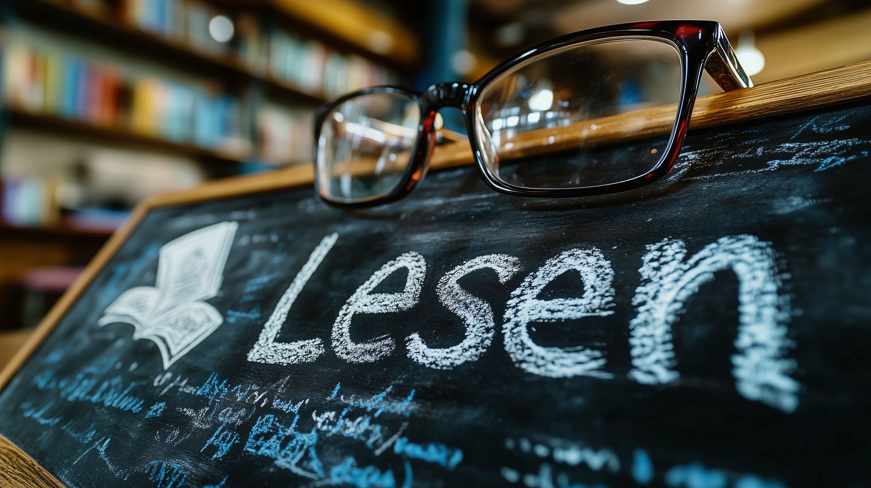 Dieses Foto zeigt eine gemütliche Bibliotheksszene mit einer Tafel, auf der das Wort 'Lesen' geschrieben steht. Im Vordergrund befinden sich eine Brille und ein Buch, die auf einer Holzoberfläche liegen. Im Hintergrund sind Bücherregale zu sehen, die eine akademische und lehrreiche Atmosphäre vermitteln. Das Bild vermittelt einen Eindruck von Ruhe, Konzentration und der Freude am Lernen und Lesen.
