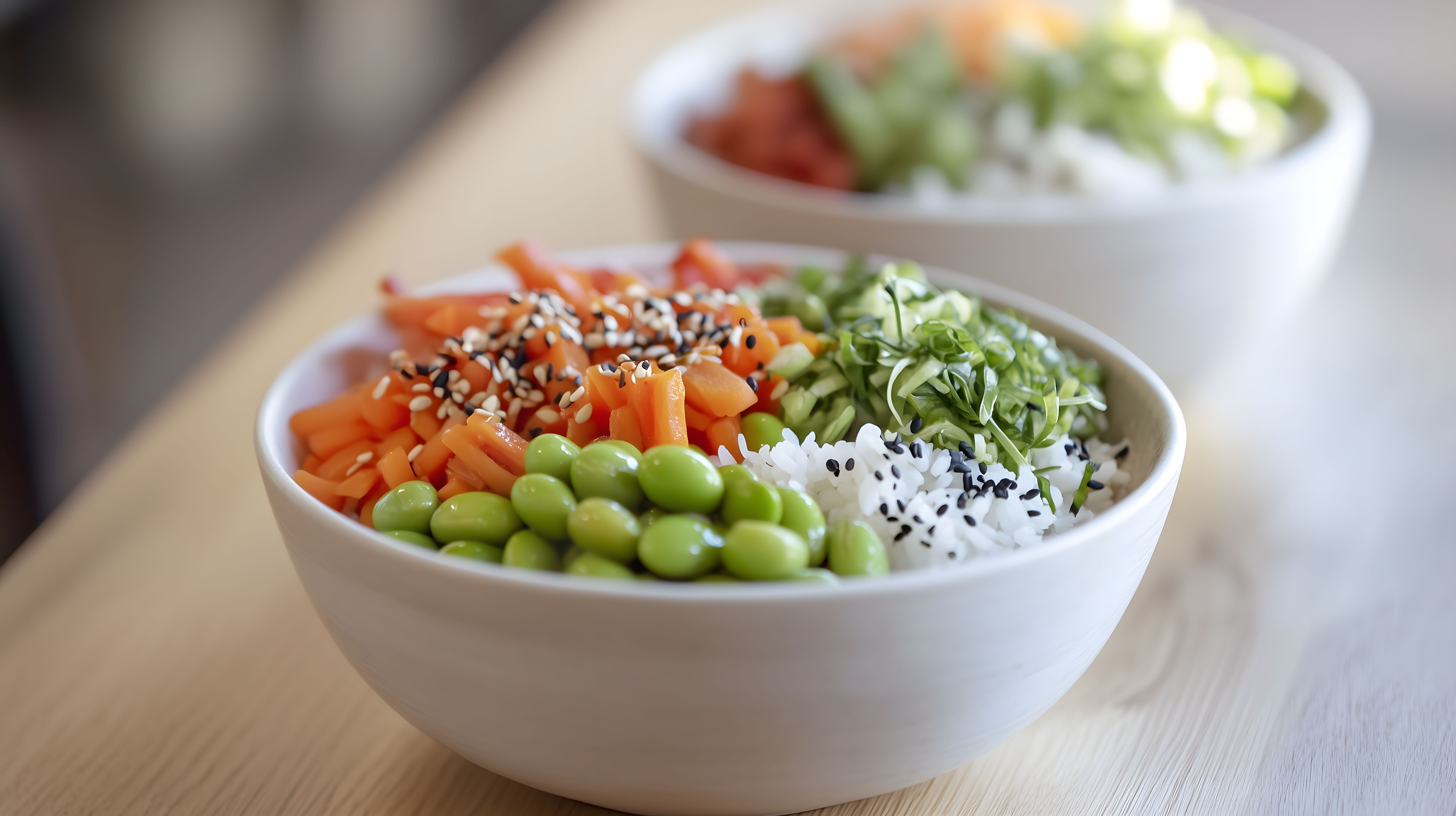 Bunte vegane Reisschüssel mit Gemüse und Edamame von Marco Verch unter Creative Commons 2.0