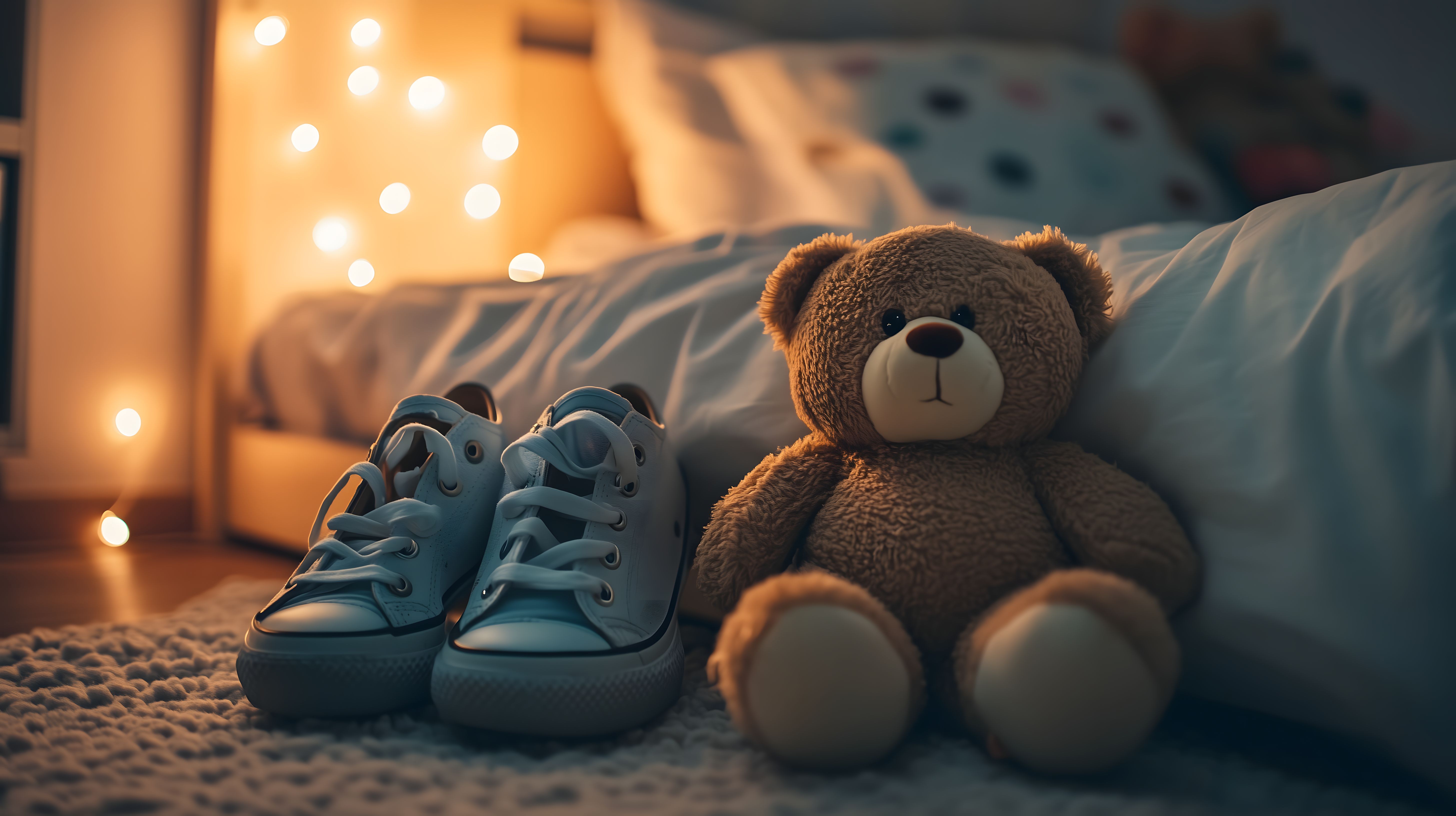 Dieses Foto zeigt eine gemütliche Szene in einem Kinderzimmer. Im Vordergrund sind ein Paar blaue Turnschuhe zu sehen, daneben sitzt ein kuschelig aussehender Teddybär. Im Hintergrund erkennt man ein Bett mit Bettwäsche und Kissen, umgeben von Lichterketten, die eine warme, entspannte Atmosphäre schaffen. Die Beleuchtung ist gedämpft, was die Gemütlichkeit und Ruhe des Raumes unterstreicht. Dieses Stockfoto ist in hoher Auflösung verfügbar und kann für verschiedene Zwecke, wie Blogs, Social-Media-Posts oder Werbematerialien, kostenfrei unter einer Creative-Commons-Lizenz genutzt werden.