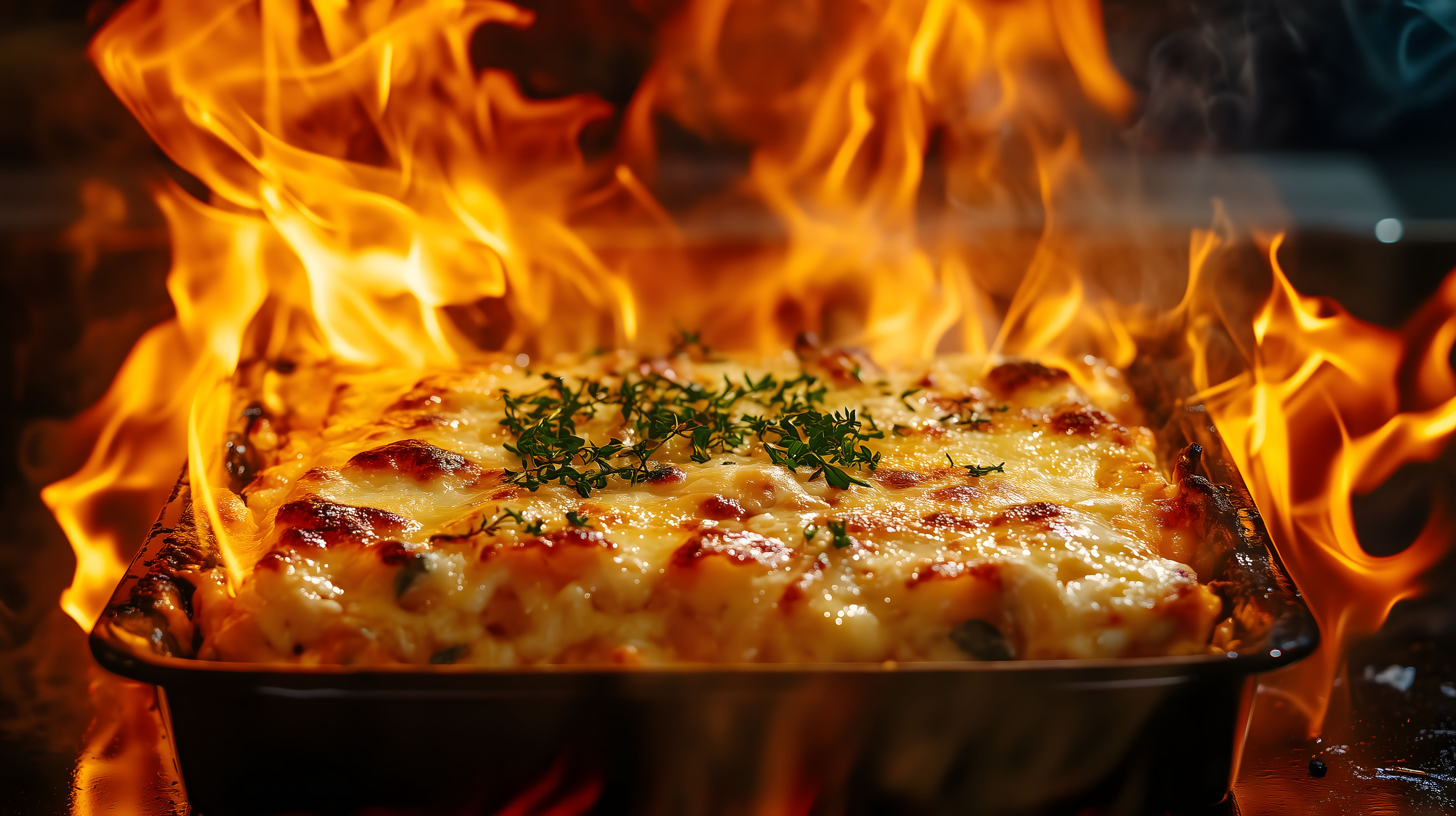 Dieses Foto zeigt einen köstlichen, goldbraun überbackenen Ofenauflauf, der von lodernden Flammen umgeben ist. Die Oberfläche ist mit geschmolzenem Käse und frischen Kräutern überzogen, was dem Gericht ein appetitliches, rustikales Aussehen verleiht. Die realistische, detaillierte Darstellung erweckt den Eindruck, als könnte man den duftenden Auflauf direkt aus dem Bild heraus genießen.