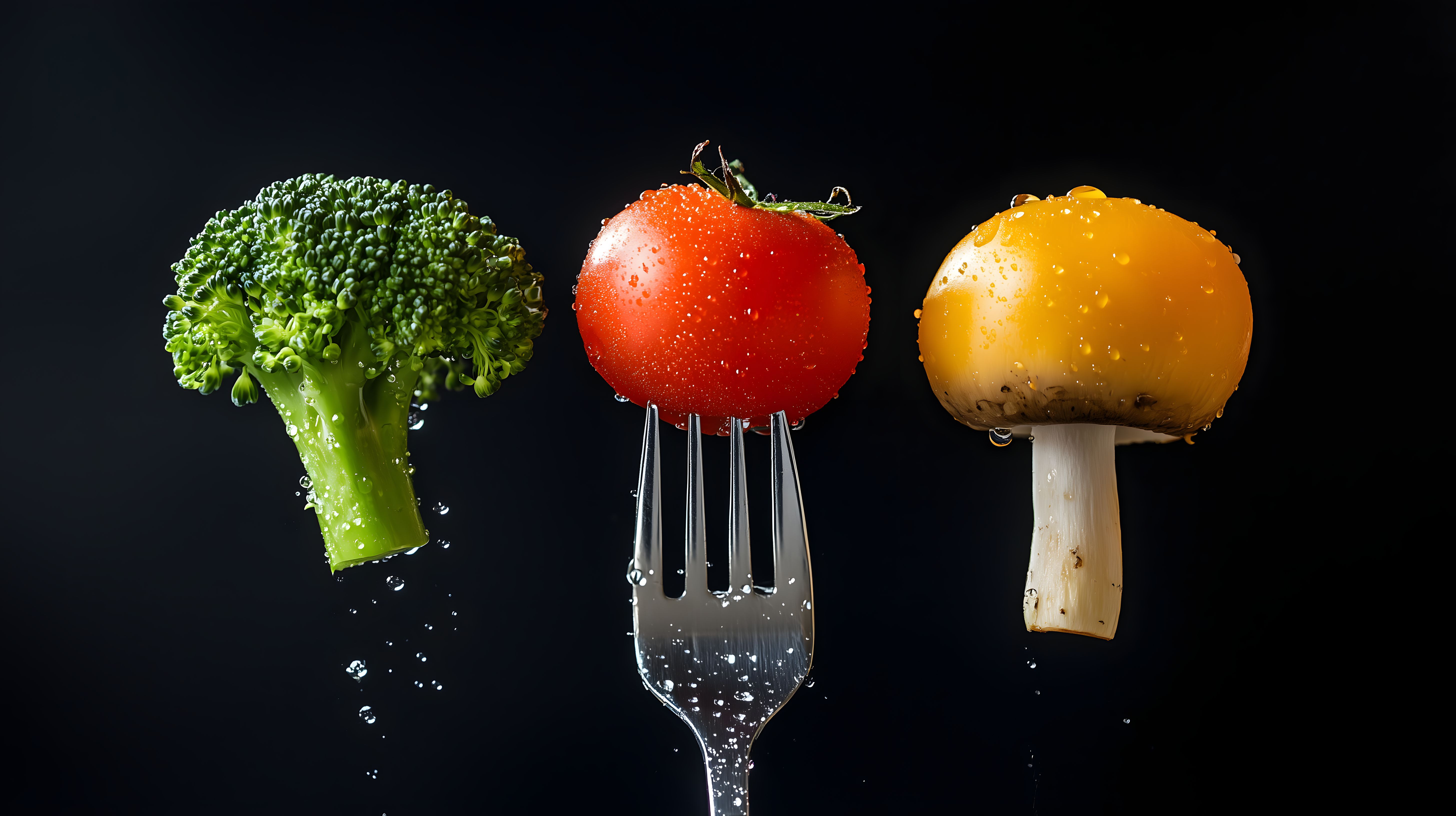 Dieses Bild zeigt eine Nahaufnahme von frischem Gemüse auf Gabeln angeordnet. Im Vordergrund sehen wir einen knackigen Brokkoli, eine saftige Tomate und einen gelben Pilz, die allesamt mit kleinen Wassertropfen überzogen sind. Die Kontraste zwischen den grünen, roten und gelben Farbtönen sowie die klare, reduzierte Bildkomposition erzeugen eine ästhetisch ansprechende, fast minimalistische Optik. Dieses Foto eignet sich hervorragend für den Einsatz in Lebensmittel-Blogs, Rezeptsammlungen oder Werbekampagnen im Bereich der gesunden Ernährung. Als hochwertiges, kostenloses Stockfoto mit Creative-Commons-Lizenz ist es frei verwendbar.