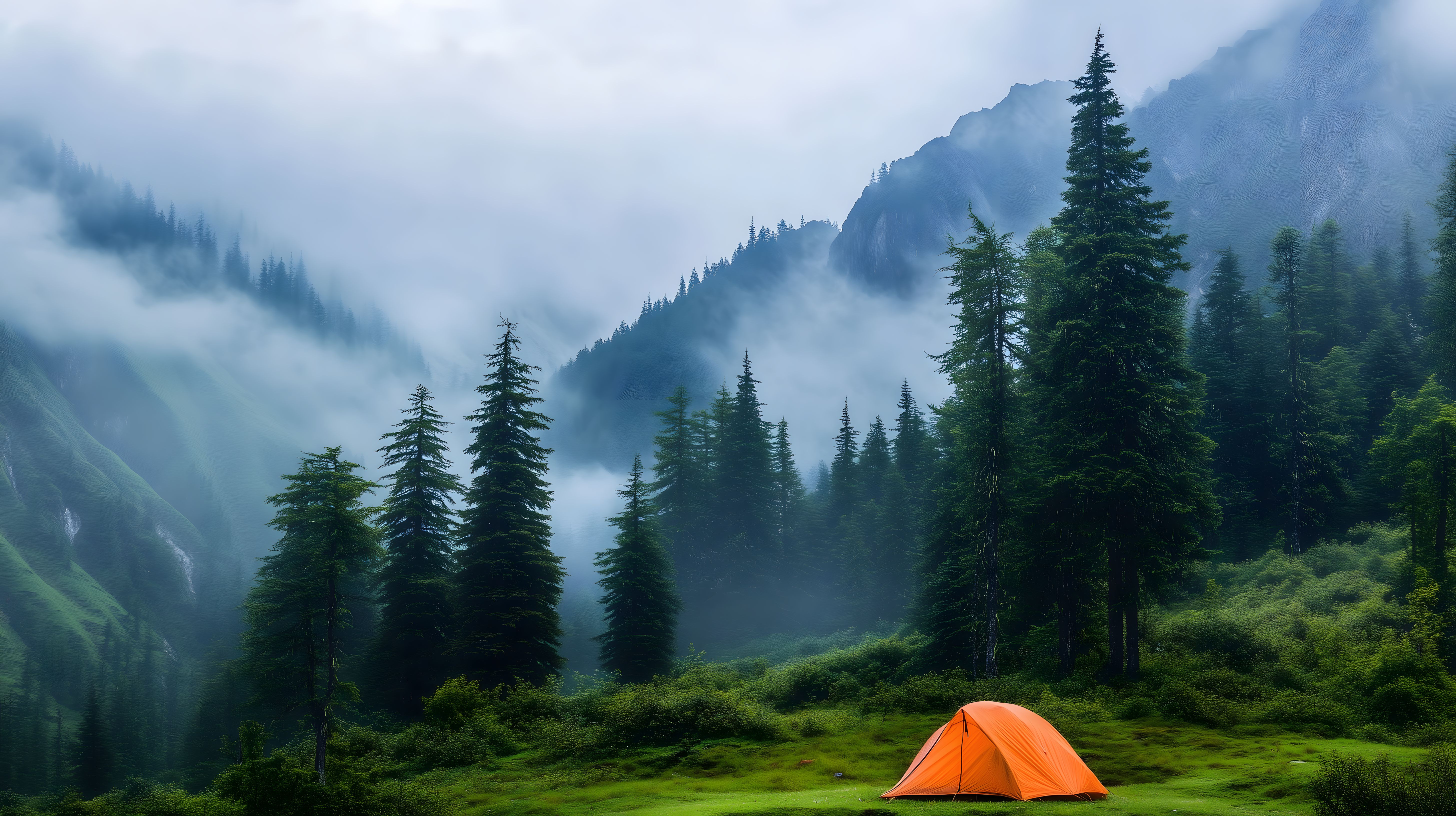 Dieses stimmungsvolle Foto zeigt eine neblige Berglandschaft mit einem orangefarbenen Zelt mitten in der Natur. Die üppig bewaldeten Hänge sind in einen mystischen Dunstschleier gehüllt, der dem Motiv eine romantische, fast geheimnisvoll anmutende Atmosphäre verleiht. Das Zelt bildet einen interessanten Kontrast zu der wilden, unberührten Umgebung und lädt dazu ein, die Natur in vollen Zügen zu genießen. Dieses kostenlose Stockfoto eignet sich hervorragend für Blogs, Newsletter, Social Media-Beiträge oder Werbeanzeigen in hoher Auflösung und unter Creative-Commons-Lizenz.