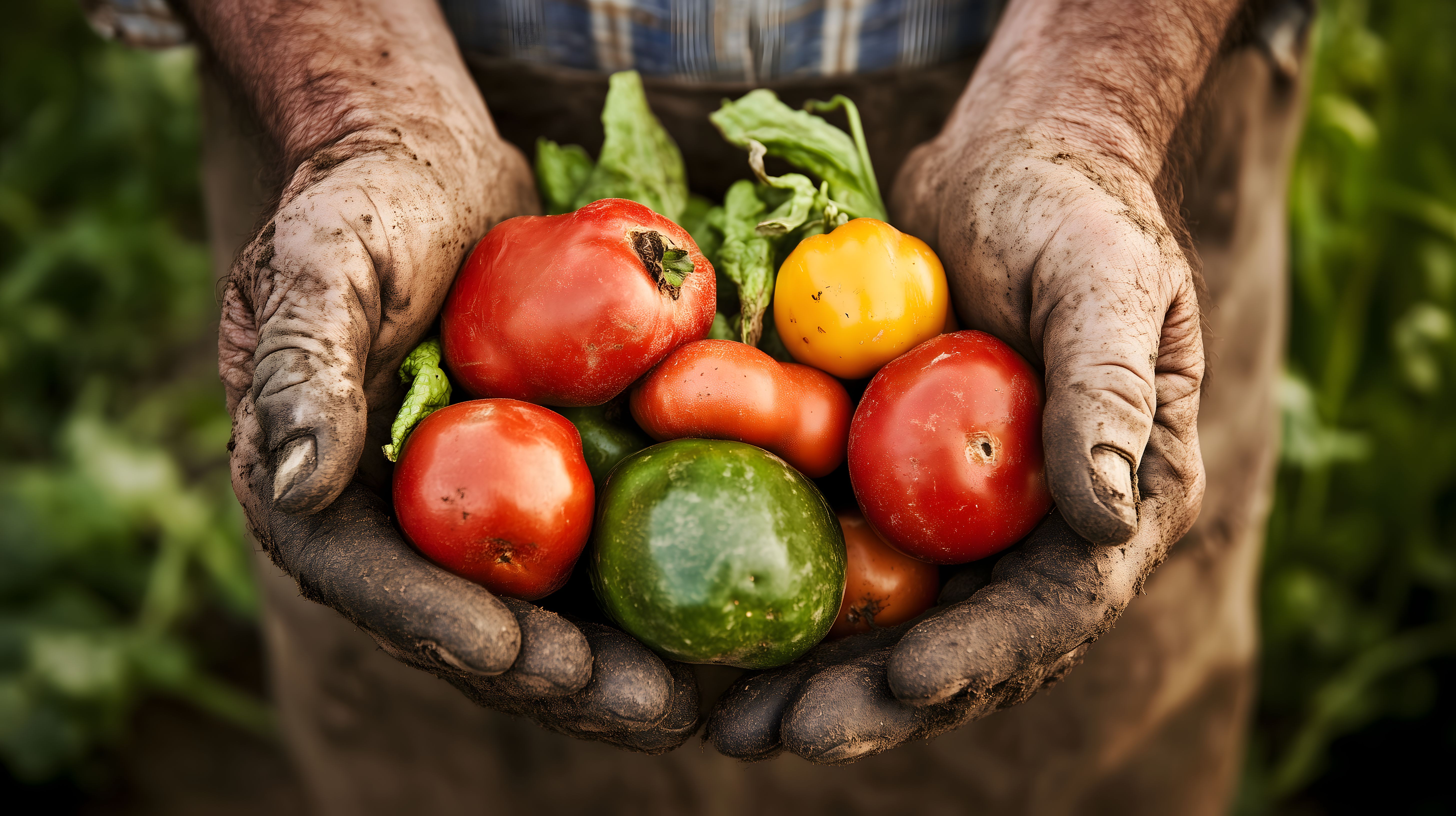 Dieses Foto zeigt eine Nahaufnahme von frisch geerntetem Bio-Gemüse in den Händen eines Landwirts. Die Schale ist mit verschiedenen Gemüsesorten wie roten Tomaten, gelber Paprika, grünem Salat und einer Avocado gefüllt. Die Hände des Landwirts sind mit Erde bedeckt, was den harten Arbeitsprozess der Ernte verdeutlicht. Das Foto vermittelt einen natürlichen, rustikalen Eindruck und weckt Assoziationen zu gesunder, regionaler und nachhaltiger Ernährung. Es eignet sich hervorragend als kostenloses Hochqualitäts-Stockfoto für Blogs, Newsletter, Social-Media-Posts oder Werbematerialien im Bereich der Landwirtschaft, Bio-Lebensmittel und gesunder Lebensweise.