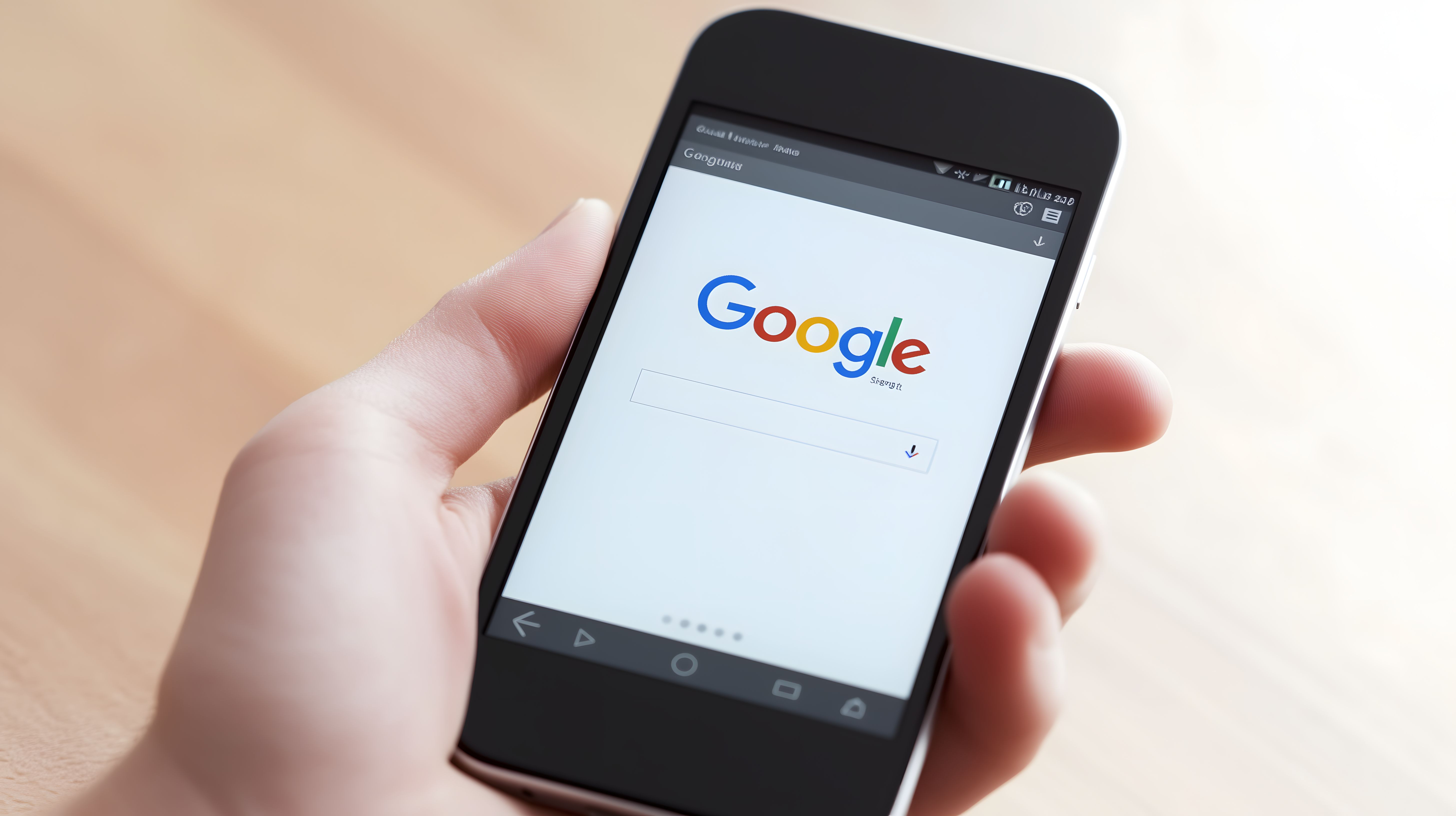 Das Foto zeigt ein Smartphone in der Hand einer Person, auf dessen Display die Google-Suchmaschine zu sehen ist. Das Smartphone befindet sich auf einem hellen, holzigen Hintergrund. Das Bild vermittelt ein modernes, minimalistisches und zeitgemäßes Konzept rund um die Internetsuche und Onlinekommunikation über mobile Endgeräte. Es eignet sich hervorragend für den Einsatz in Blogbeiträgen, Newslettern oder Social-Media-Posts, die sich mit Themen wie Websuche, Technologie oder digitales Marketing beschäftigen. Dieses hochwertige Stockfoto ist in hoher Auflösung unter der Creative-Commons-Lizenz kostenfrei verfügbar.