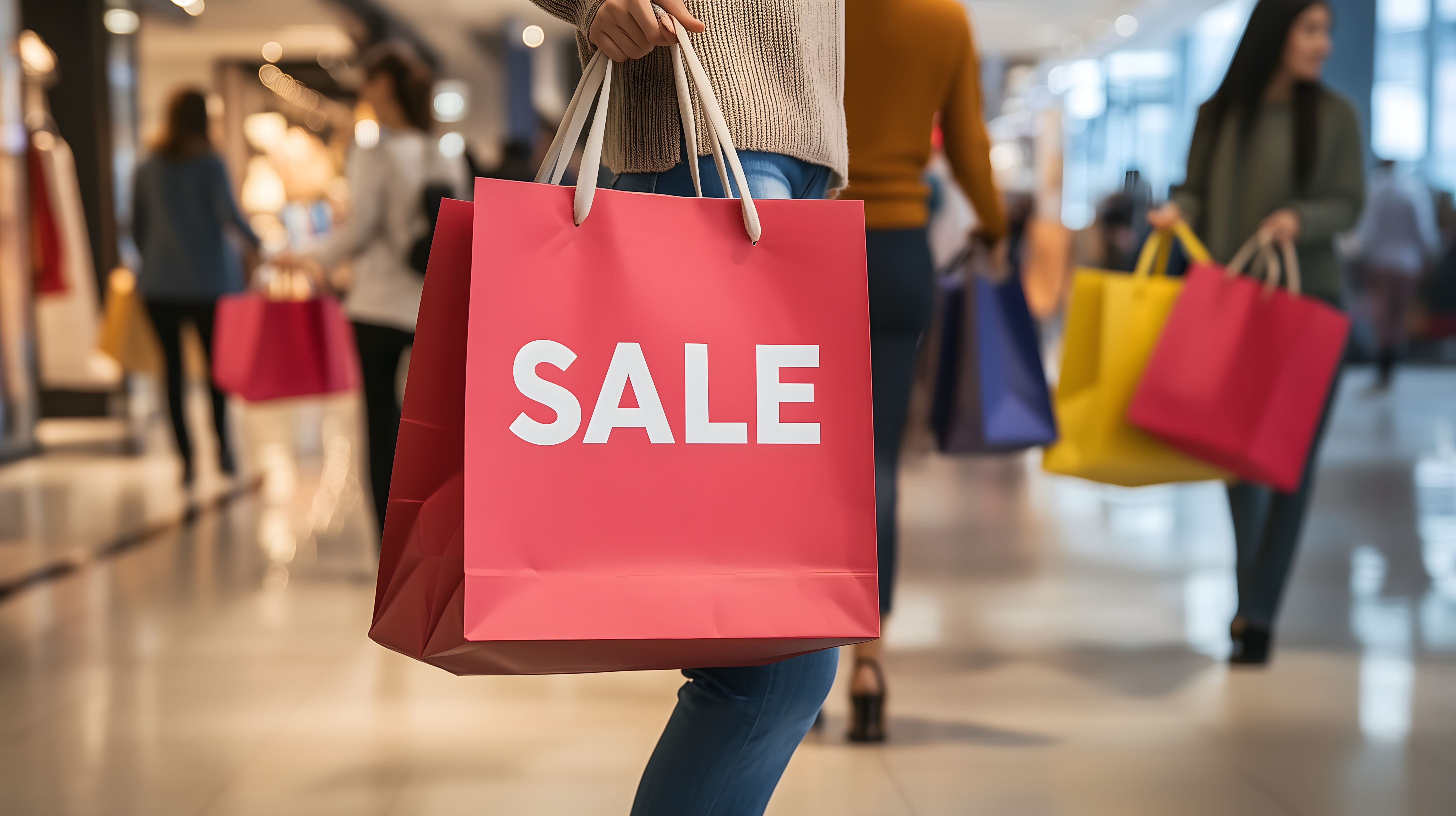 Das Bild zeigt eine rote Einkaufstasche, die eine große weiße Aufschrift 'SALE' trägt. Die Tasche wird von einer Person in einer belebten Einkaufspassage getragen, wo weitere Personen mit Einkaufstaschen sichtbar sind. Das Foto vermittelt eine Atmosphäre des Sonderverkaufs und der Konsumfreude im Einzelhandel. Das Bild eignet sich ideal für den Einsatz in Werbung, Newslettern oder Social-Media-Beiträgen rund um Verkaufsaktionen, Rabatte und Sonderangebote. Als kostenloses Stockfoto in hoher Auflösung und unter einer Creative-Commons-Lizenz ist es vielfältig verwendbar.