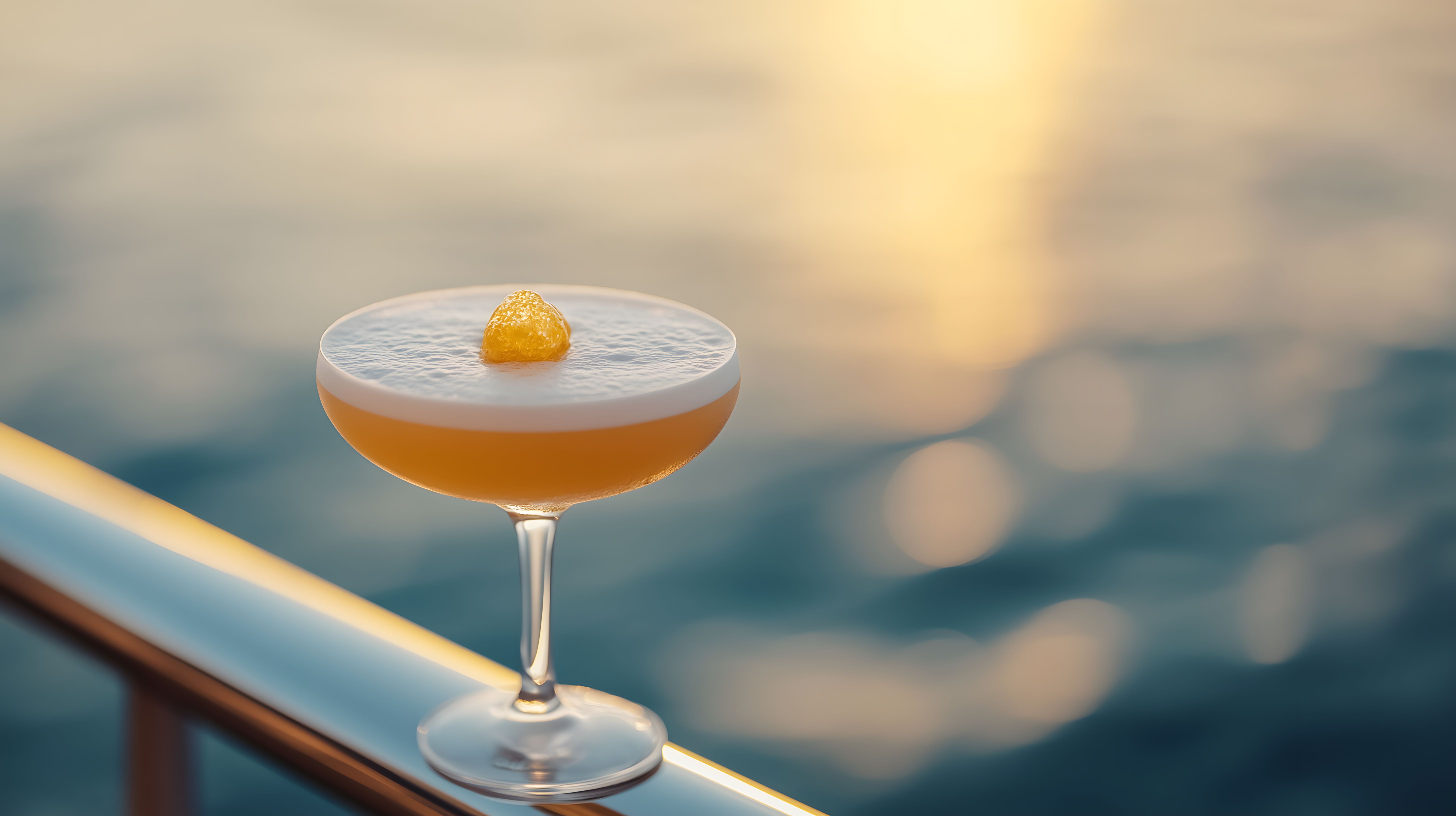 Dieses stimmungsvolle Foto zeigt einen eleganten Cocktail auf einem Kreuzfahrtschiff bei Sonnenuntergang. Der bernsteinfarbene Drink mit leichter Schaumkrone ist in einem hochklassigen Cocktailglas serviert und garniert mit einer orangen Zitrusfrucht. Im Hintergrund spiegelt sich das warme Abendlicht auf dem ruhigen Meer. Die Szene vermittelt eine entspannte, luxuriöse Atmosphäre und lädt dazu ein, den Feierabend oder Urlaub in vollen Zügen zu genießen. Dieses hochauflösende Stockfoto ist unter der Creative-Commons-Lizenz kostenlos für private und kommerzielle Zwecke verwendbar.