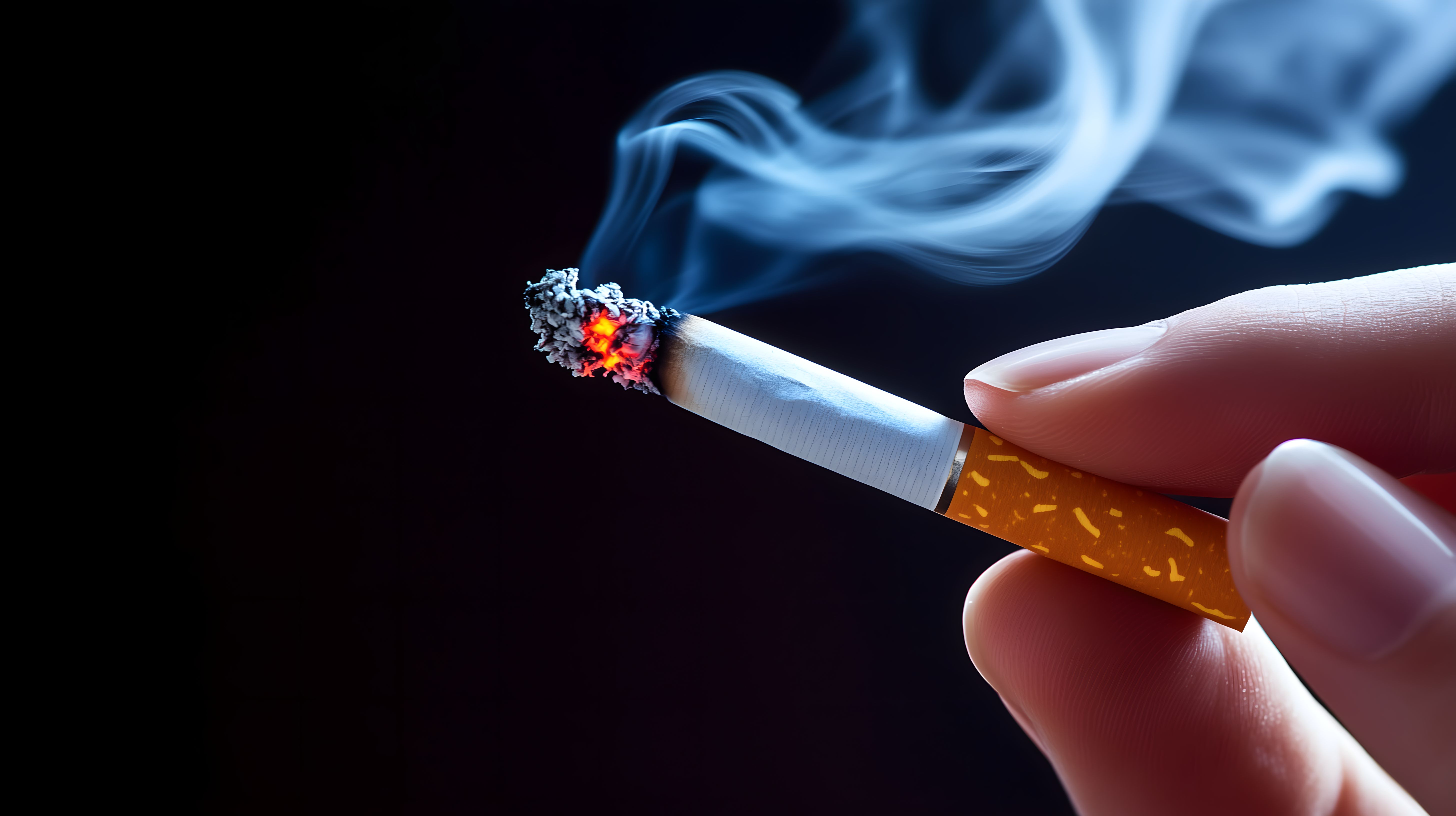 Das Bild zeigt eine glimmende Zigarette, die in einer Hand gehalten wird, vor einem dunklen Hintergrund. Die Zigarette strahlt eine rötliche Glut aus, die von bläulichen Rauchschwaden umgeben ist. Das Foto bietet eine detailreiche Nahaufnahme, die den Fokus auf den Raucherarm und die Finger lenkt. Dieses Stockfoto eignet sich hervorragend für Beiträge in Blogs, Newsletter oder Social-Media-Kampagnen, die sich mit den Gefahren des Rauchens, Suchtthemen oder Gesundheitsrisiken beschäftigen. Es steht unter einer Creative-Commons-Lizenz zur freien Verwendung in hoher Auflösung zur Verfügung.