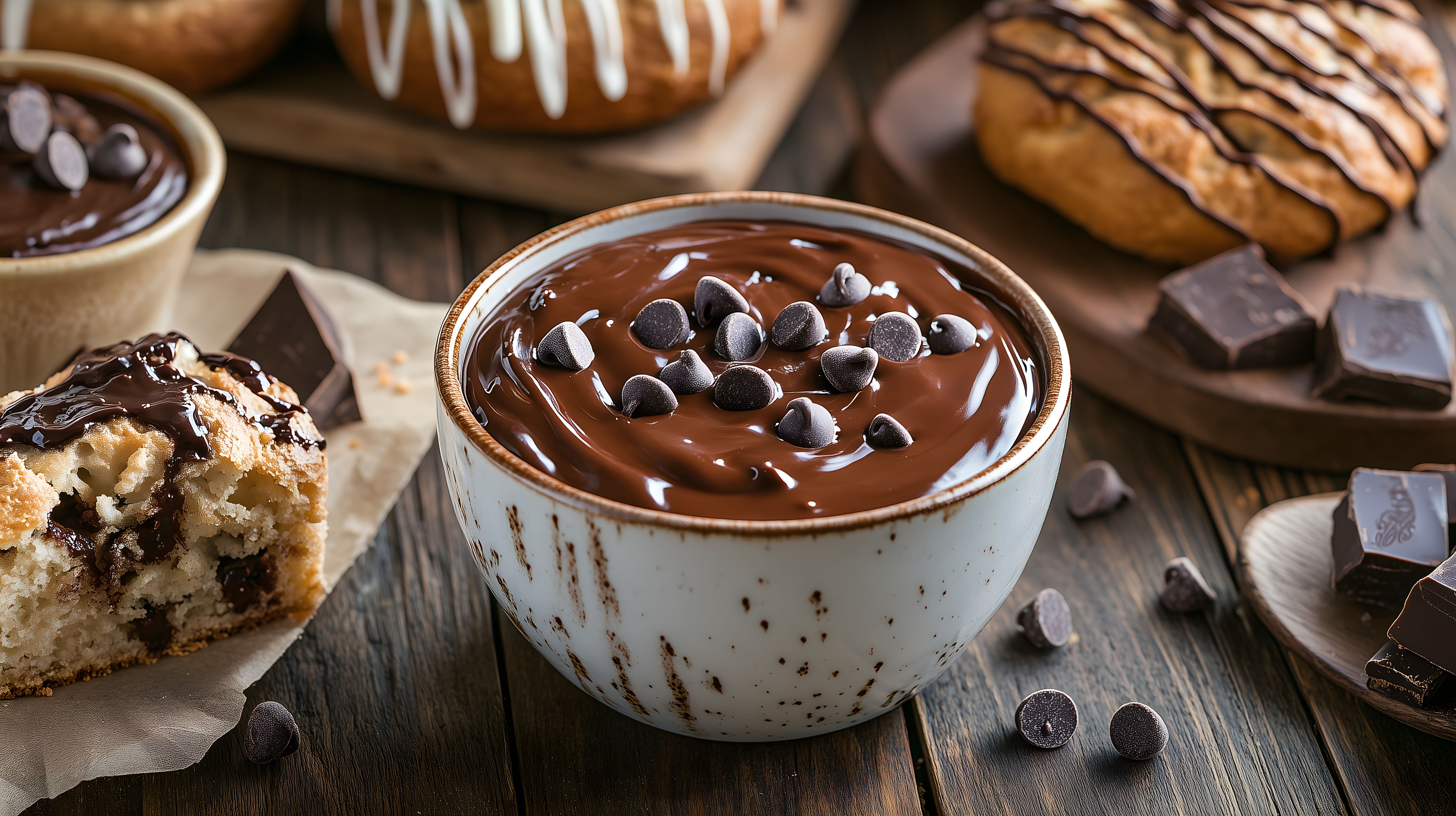 Dieses Foto zeigt eine Schale voller flüssiger Schokolade, die mit Schokochips garniert ist. Umgeben ist die Schüssel von verschiedenem Gebäck wie Croissants und anderen süßen Leckereien. Die warmen Brauntöne und der rustikale Holztisch schaffen eine gemütliche, appetitanregende Atmosphäre. Das Foto eignet sich hervorragend für Verwendung in Rezepten, Artikeln über Desserts oder Lebensmittelwerbung. Als kostenloses Stockfoto in hoher Auflösung und unter Creative Commons-Lizenz ist es vielseitig einsetzbar.