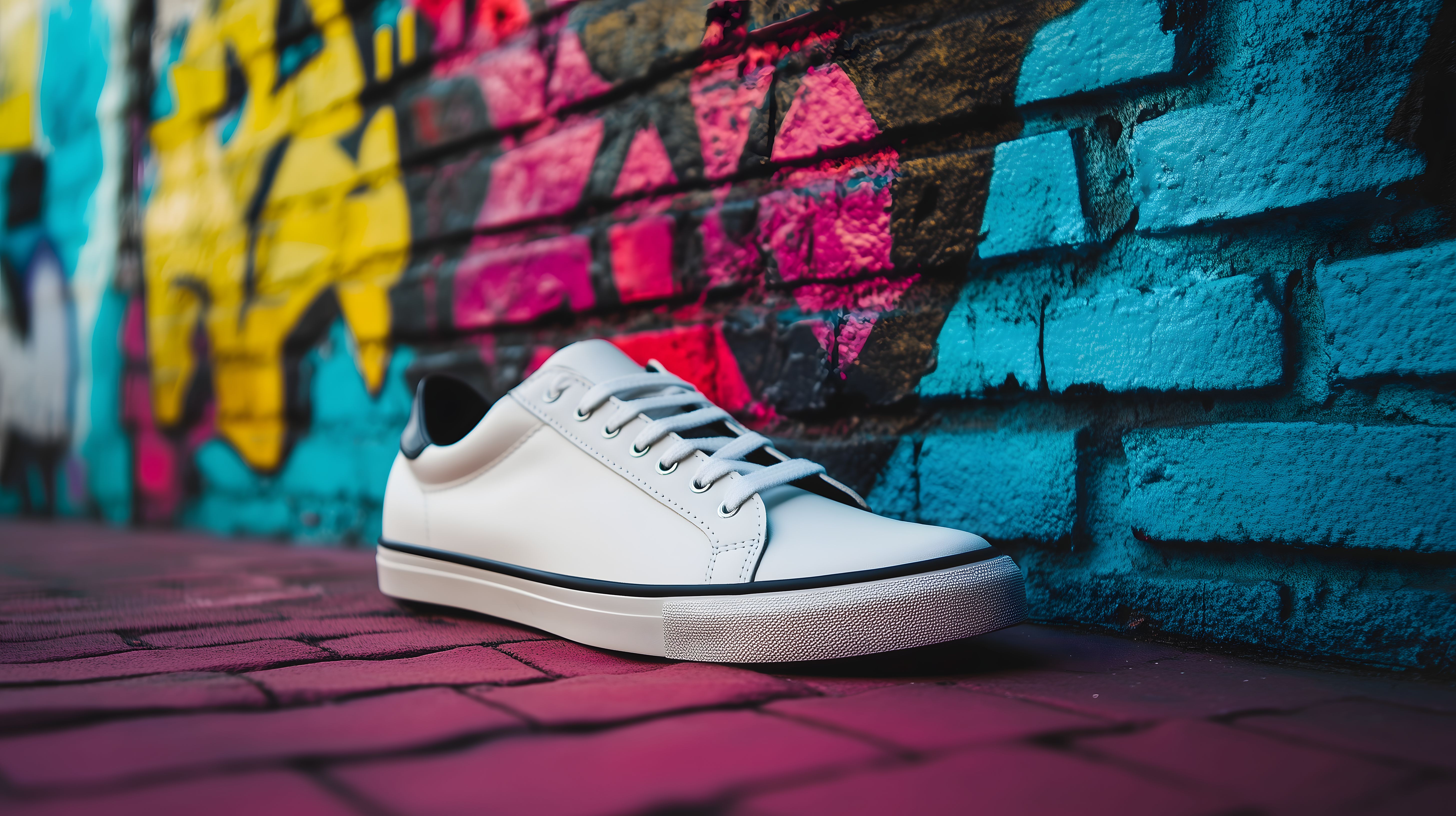 Das Bild zeigt einen lässigen, weißen Sneaker, der vor einer bunten Graffitiwand platziert ist. Die Wand im Hintergrund ist mit abstrakten, farbenfrohen Motiven bemalt, die einen kreativen, urbanen Stil vermitteln. Der Schuh nimmt dabei eine zentrale Position ein und sticht durch seine schlichte, aber moderne Optik hervor. Dieses Foto eignet sich hervorragend als Hintergrundbild für Blog-Beiträge, Newsletter oder Social-Media-Kanäle rund um Themen wie Streetwear, Lifestyle oder urbane Trends. Als kostenloses Stockfoto in hoher Auflösung und unter der Creative-Commons-Lizenz verfügbar, lässt es sich vielseitig einsetzen.