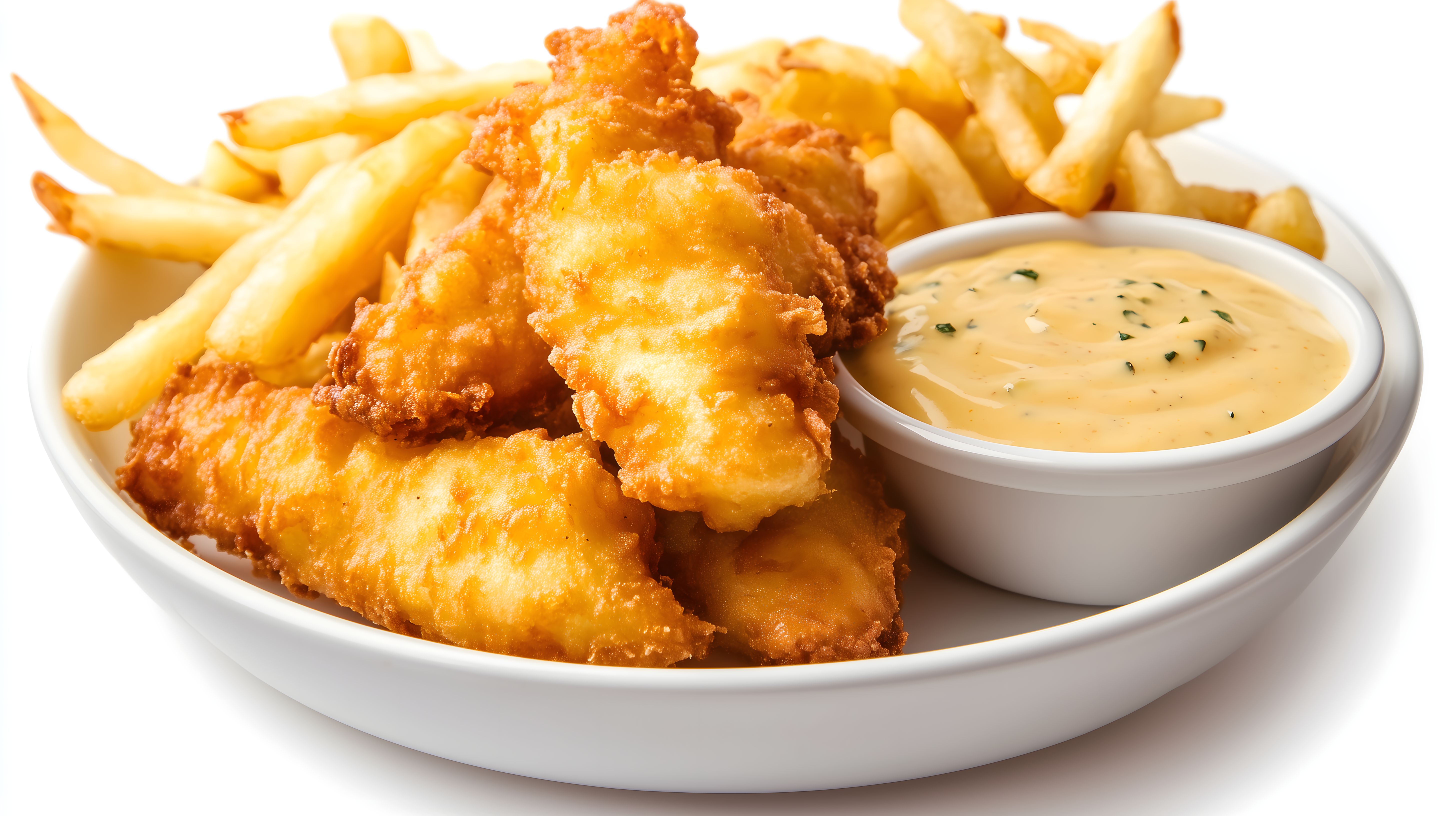 Das Foto zeigt ein appetitliches Gericht aus goldbraun gebratenem Fischfilet, dazu knusprige Pommes Frites und eine cremige Kräutersoße. Das Gericht ist auf einem weißen Teller angerichtet, wodurch die Farben und Texturen optimal zur Geltung kommen. Das Bild strahlt eine leckere und einladende Atmosphäre aus und eignet sich hervorragend für die Verwendung in Blogs, Newslettern, sozialen Medien oder Werbematerialien rund um das Thema Gastronomie, Kulinarik und Ernährung. Als kostenloses Stockfoto in hoher Auflösung und unter einer Creative Commons-Lizenz kann es frei genutzt werden.