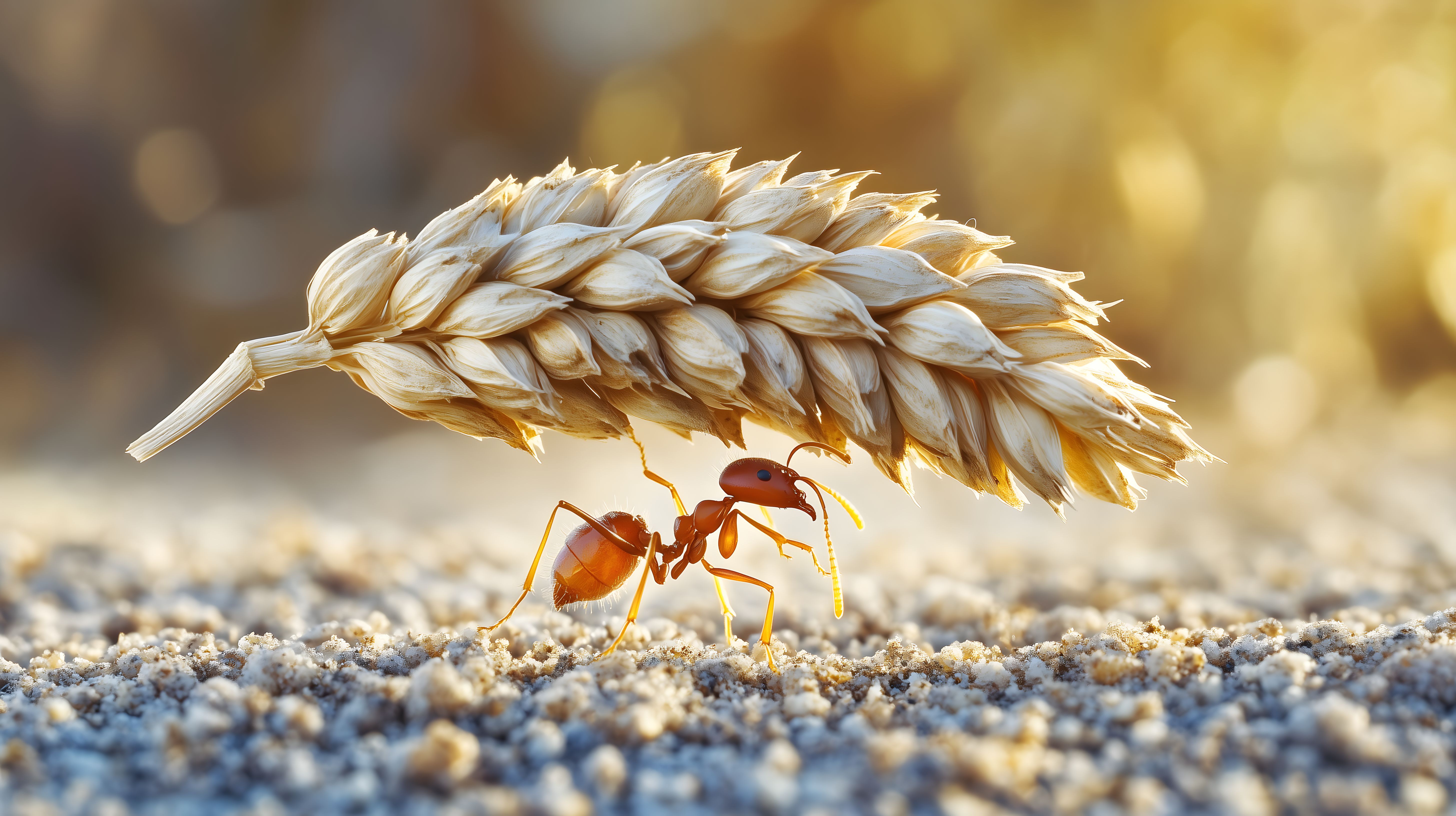 Dieses faszinierende Foto zeigt eine Ameise, die ein erstaunlich großes Getreidekorn über eine raue, granitartige Oberfläche trägt. Das Bild ist in warmen, goldenen Tönen gehalten und gibt dem Betrachter einen Einblick in die erstaunliche Kraft und Ausdauer dieser kleinen Insekten. Die scharfe Fokussierung auf die Ameise und das detaillierte Muster des Getreidekorns verleihen dem Bild eine beeindruckende Tiefe und Klarheit. Dieses hochauflösende, kostenlose Stockfoto eignet sich hervorragend für Verwendung in Blogs, Newslettern, sozialen Medien oder Werbematerialien, bei denen eine natürliche, detailreiche Darstellung der Natur gefragt ist.