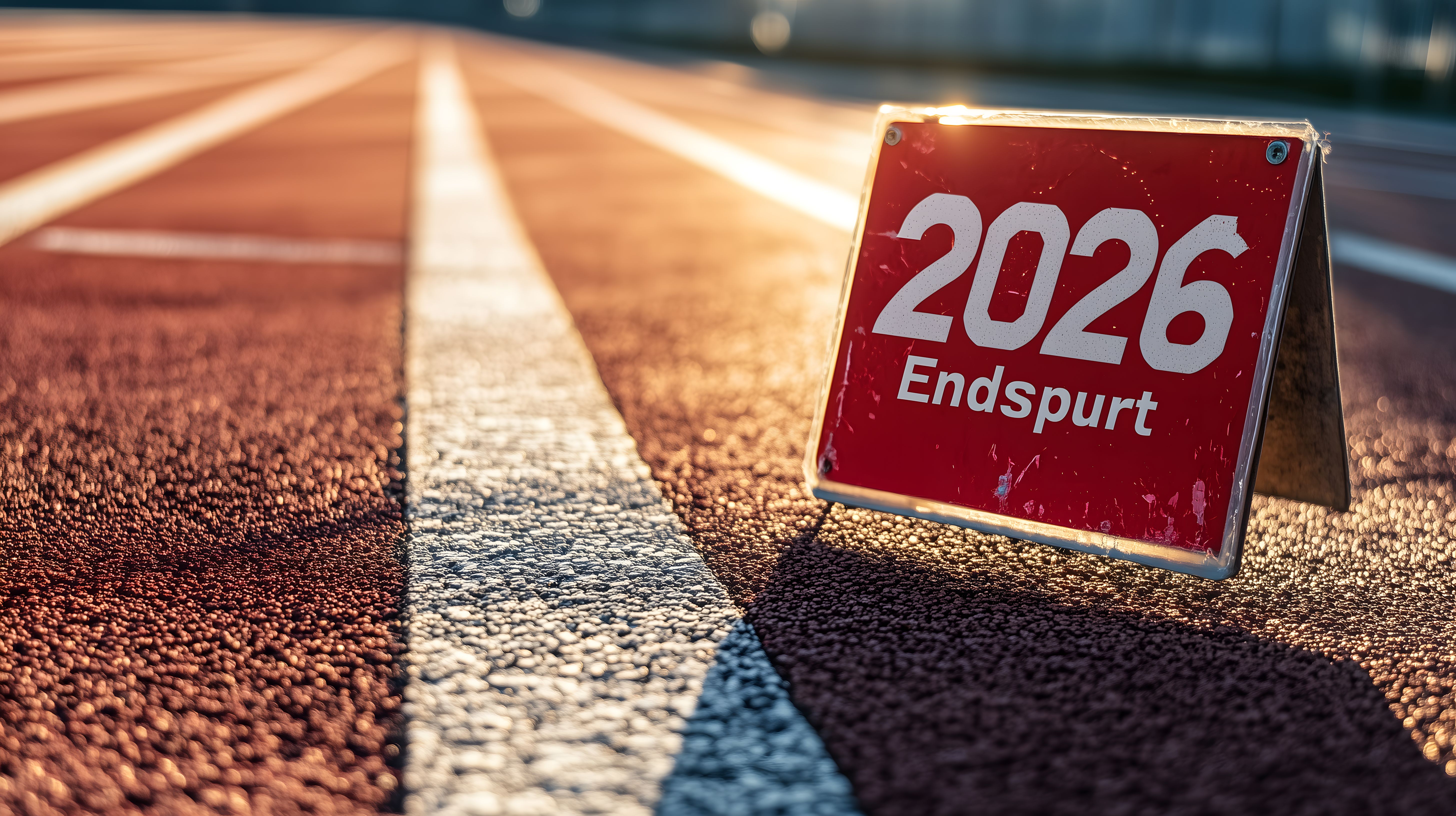 Das Foto zeigt eine beleuchtete Laufbahn mit einer roten Laufwegleuchte in der Mitte. Die Laufbahn ist beleuchtet und erstreckt sich in einer perspektivischen Ansicht in die Ferne. Die rote Leuchte hebt sich kontrastreich von der Umgebung ab und weist auf das Jahr 2026 und den bevorstehenden 'Endspurt' hin. Das Bild vermittelt einen Eindruck von Bewegung, Wettbewerb und dem Erreichen eines Ziels. Es eignet sich hervorragend als hochwertiges, kostenloses Stockfoto für Blogs, Newsletter, Social-Media-Beiträge oder Werbematerialien mit Bezug zu Sport, Wettbewerb, Ziele oder Zukunftsvisionen. Die Datei ist in hoher Auflösung und unter einer Creative-Commons-Lizenz verfügbar.