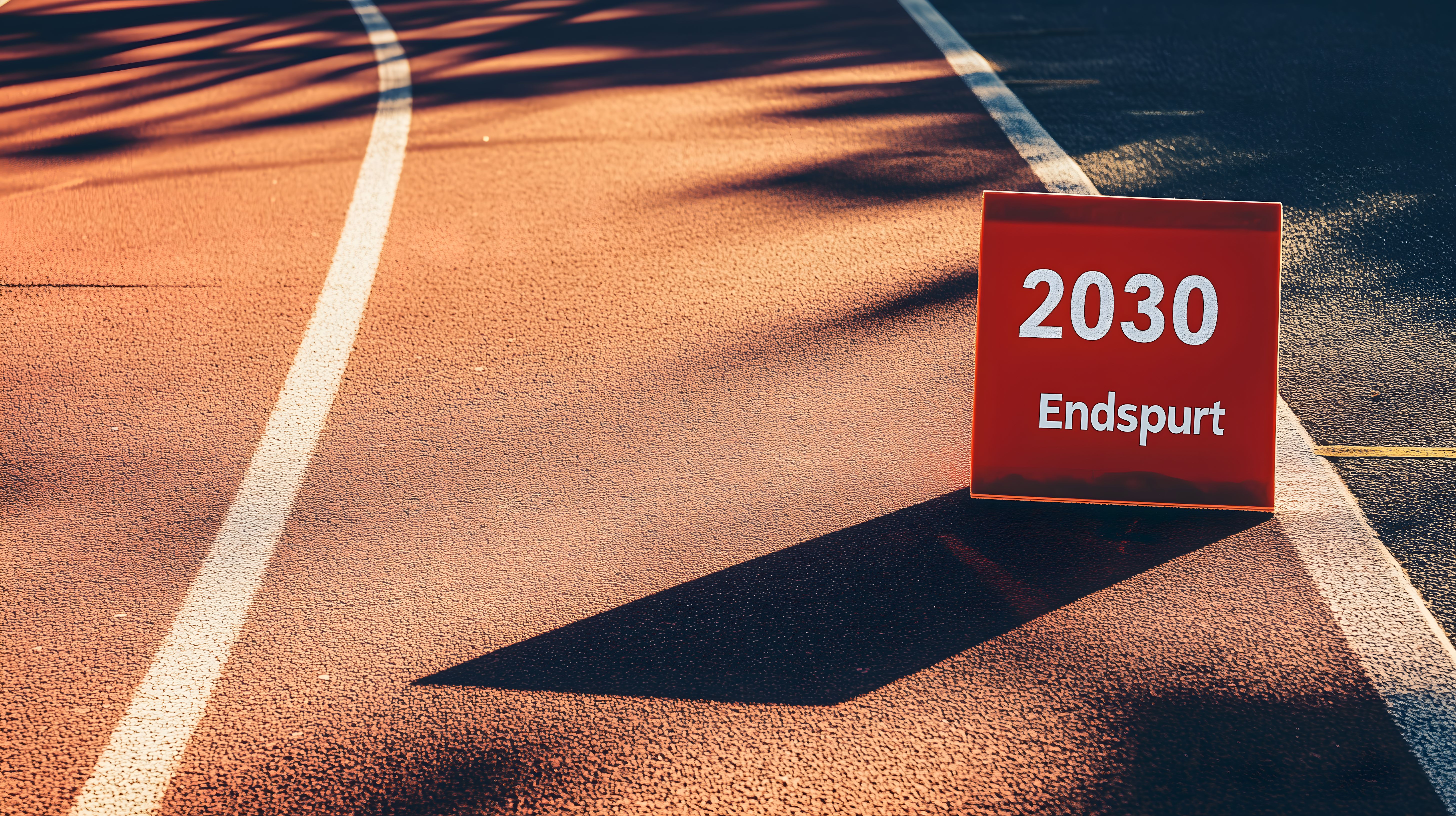 Dieses Foto zeigt eine Laufbahn mit einer Anzeige für das Jahr 2030 und einem Endspurt-Schriftzug. Die Bahn ist in einem orangefarbenen Licht getaucht, das von links her einfällt und einen Schatten wirft. Dieser Effekt verleiht dem Bild eine dynamische und bewegte Atmosphäre, die das Thema der Leistung und des sportlichen Erfolgs unterstreicht. Das Foto eignet sich hervorragend als Stockfoto für Blogbeiträge, Newsletter oder Social-Media-Posts zu Themen wie Motivation, Zukunftsplanung, Sport und Freizeit. Es ist in hoher Auflösung verfügbar und kann unter einer Creative-Commons-Lizenz genutzt werden.