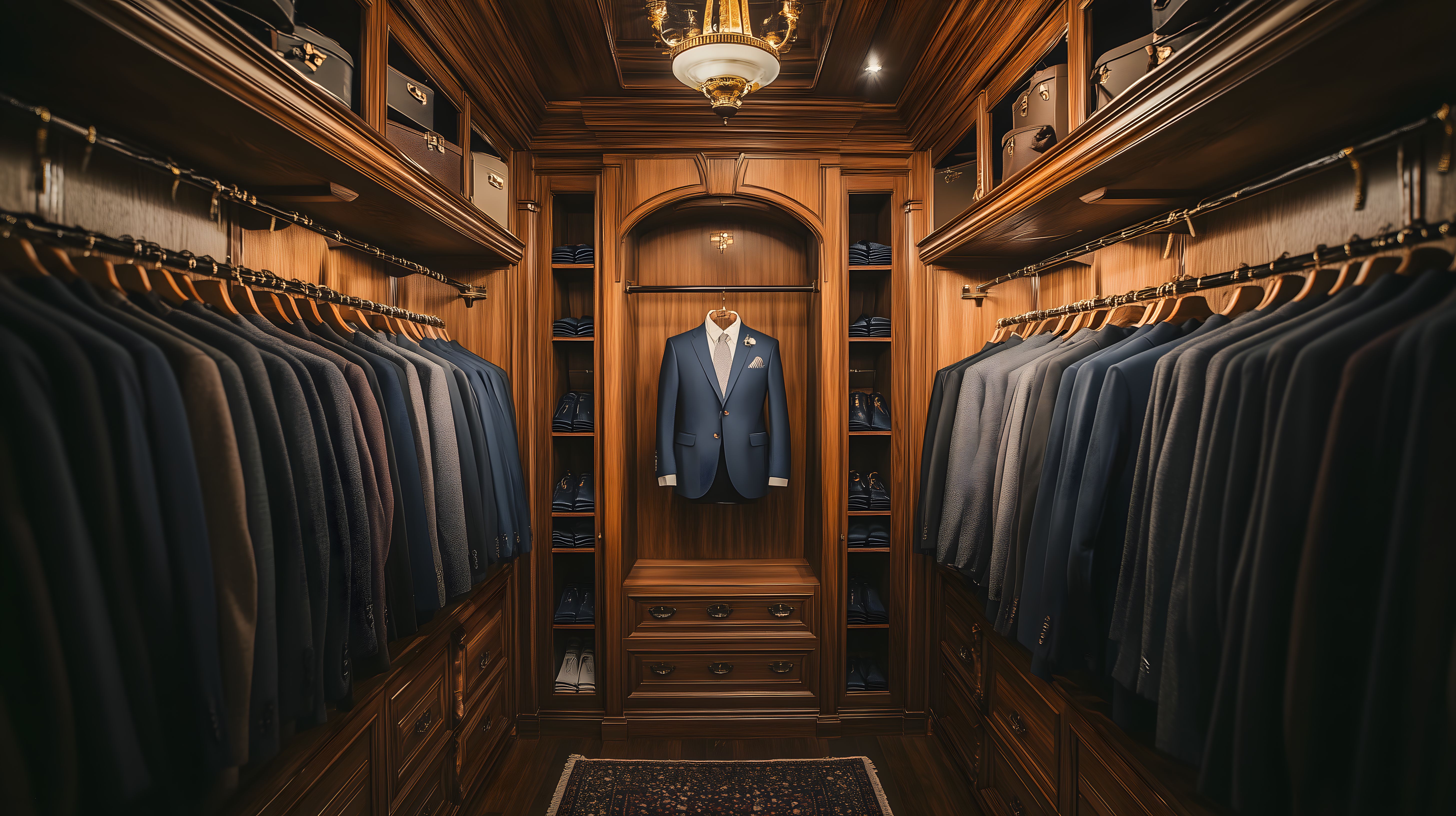 Dieses beeindruckende Foto zeigt einen eleganten begehbaren Kleiderschrank, der mit edlen Holzvertäfelungen und einem prachtvollen Kronleuchter ausgestattet ist. In den Regalen hängen hochwertige Anzüge, die perfekt präsentiert werden. Dieser Ankleideschrank strahlt Luxus, Exklusivität und klassisches Design aus. Das Foto eignet sich hervorragend für den Einsatz in Blogs, Newslettern oder Werbekampagnen, die ein gehobenes, stilvolles Ambiente transportieren wollen. Als kostenloses, hochauflösendes Stockfoto unter Creative-Commons-Lizenz kann es vielfältig genutzt werden.