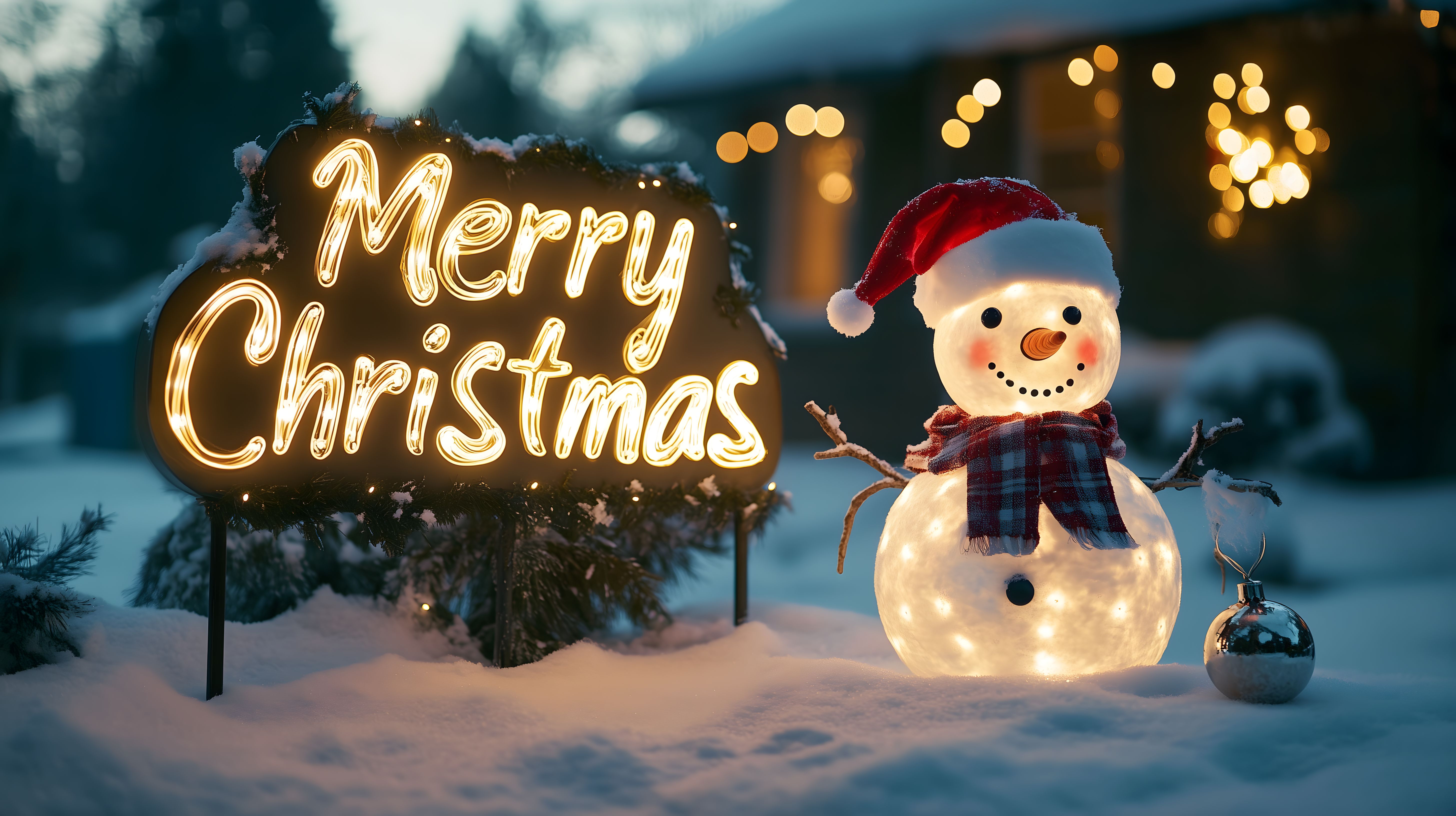 Dieses stimmungsvolle Weihnachtsfoto zeigt eine verschneite Winterlandschaft bei Nacht. Im Vordergrund steht eine beleuchtete Schneefigur in einem roten Schal und Mütze, die von Schnee umgeben ist. Im Hintergrund ist ein leuchtendes Schild mit der Aufschrift 'Merry Christmas' zu sehen, umgeben von funkelnden Lichtern und einer malerischen Szenerie. Das Bild vermittelt eine festliche, stimmungsvolle Winteratmosphäre und ist ideal für die Verwendung in Weihnachtsgrüßen, Newslettern, Blogbeiträgen oder Werbematerialien.
