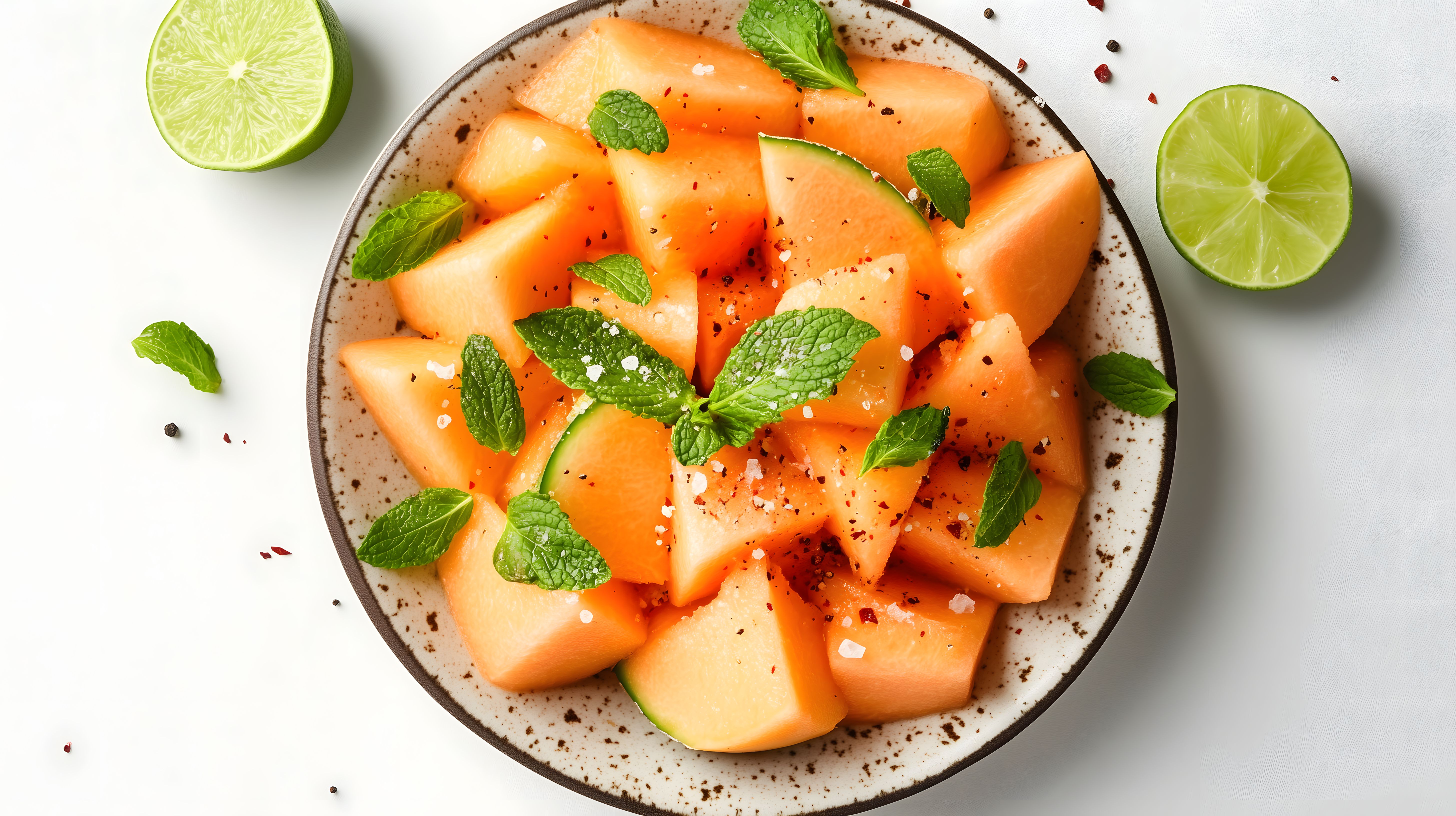 Dieses Foto zeigt frisch geschnittene Melonenstücke, die in einer rustikalen Schale angerichtet sind. Die Melonenstücke sind saftig und orange, bestreut mit grünen Minzblättern und etwas Limettensaft. Der Hintergrund ist eine weiße, glatte Oberfläche, die den Fokus ganz auf die appetitlichen Früchte lenkt. Dieses Bild eignet sich hervorragend als Stockfoto für Rezepte, Salate, Desserts oder gesunde Snacks. Es ist in hoher Auflösung und unter der Creative-Commons-Lizenz frei nutzbar.