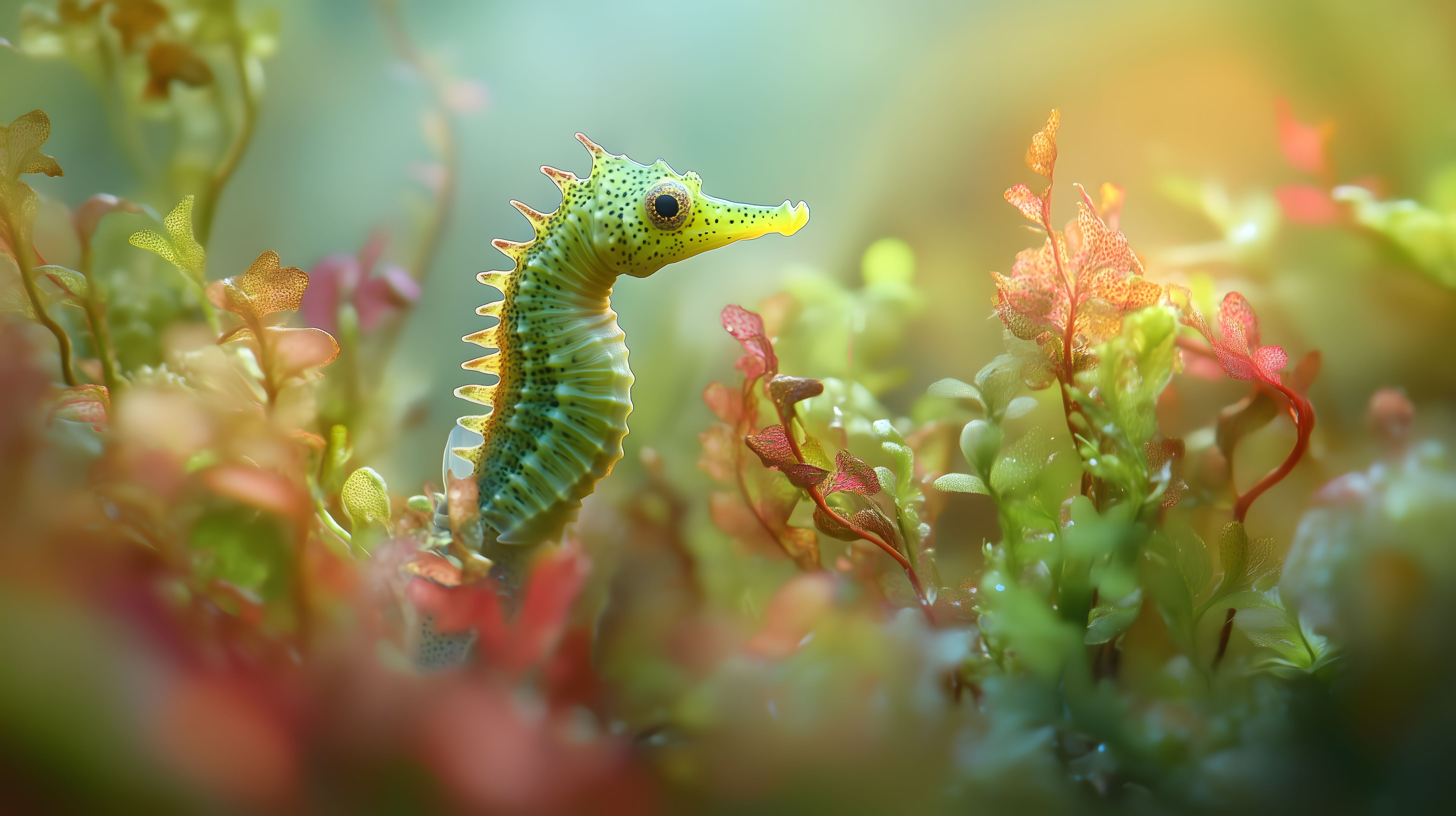 Dieses faszinierende Foto zeigt ein grünes Seepferdchen, das sich zwischen bunten Wasserpflanzen in seiner natürlichen Unterwasserwelt bewegt. Die detailreiche Nahaufnahme offenbart die farbenfrohen Strukturen und Texturen des Tiers sowie der umgebenden Vegetation, die in einem warmen, stimmungsvollen Licht getaucht sind. Das Bild vermittelt einen Eindruck von der Schönheit und Vielfalt des Lebens unter Wasser und eignet sich hervorragend für den Einsatz in Blogs, Newslettern, Social-Media-Posts oder Werbekampagnen rund um Natur-, Tier- und Unterwasserthemen. Als hochwertiges, kostenloses Stockfoto unter der Creative-Commons-Lizenz ist es frei nutzbar.