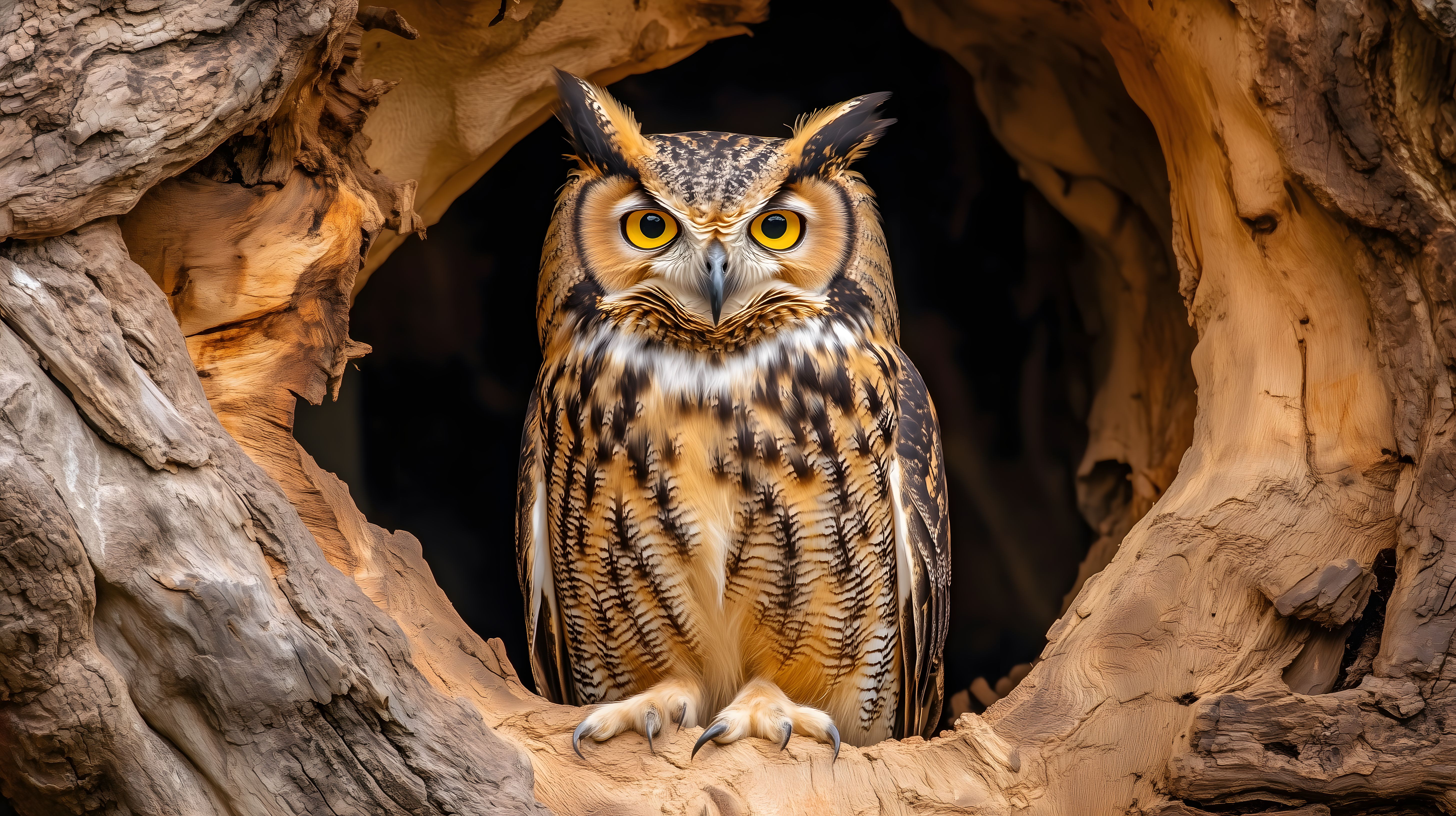 Dieses atemberaubende Foto zeigt eine majestätische Eule, die in einer Baumhöhle sitzt und den Betrachter mit ihren intensiven gelben Augen fesselt. Das Bild besticht durch seine natürliche Ästhetik und die perfekte Komposition, die die Schönheit und Eleganz des Tieres in den Vordergrund stellt.