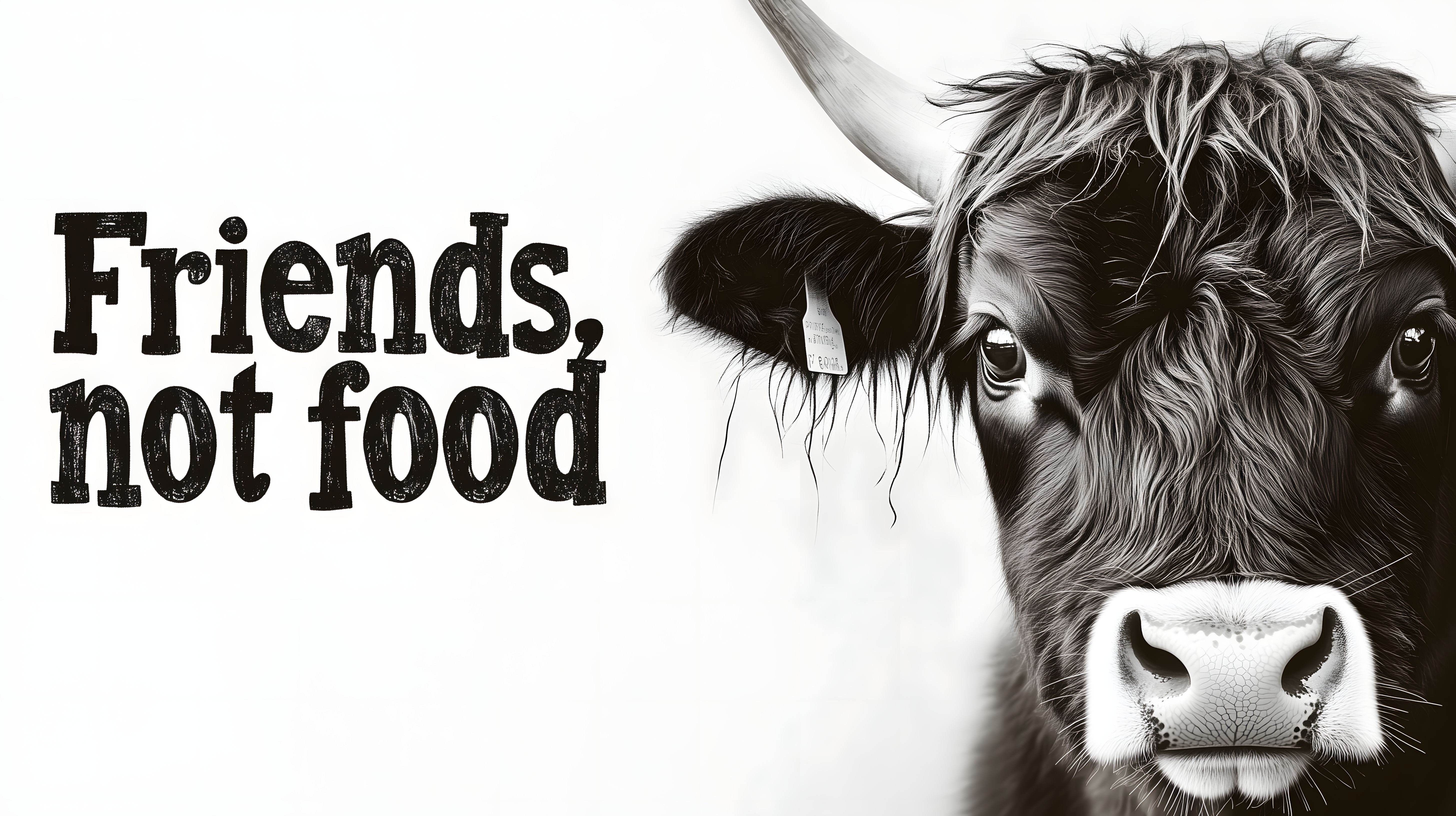 Dieses beeindruckende Schwarzweißfoto zeigt das Porträt einer Hochlandrindkuh mit einer provokanten Botschaft. Die Kuh blickt dem Betrachter direkt in die Augen, während der Schriftzug 'Friends, not food' prominent im Vordergrund platziert ist. Die Aufnahme besticht durch ihr kraftvolles, kontrastreichen Design und vermittelt eine starke, ethische Botschaft. Das Bild eignet sich hervorragend für den Einsatz in Blogs, Newslettern oder sozialen Medien, um beispielsweise Themen wie Tierschutz, Nachhaltigkeit oder Veganismus aufzugreifen. Dieses hochauflösende, kostenlose Stockfoto unter Creative-Commons-Lizenz bietet Kreative zahlreiche Möglichkeiten, ethische Statements in ihre Projekte einzubinden.