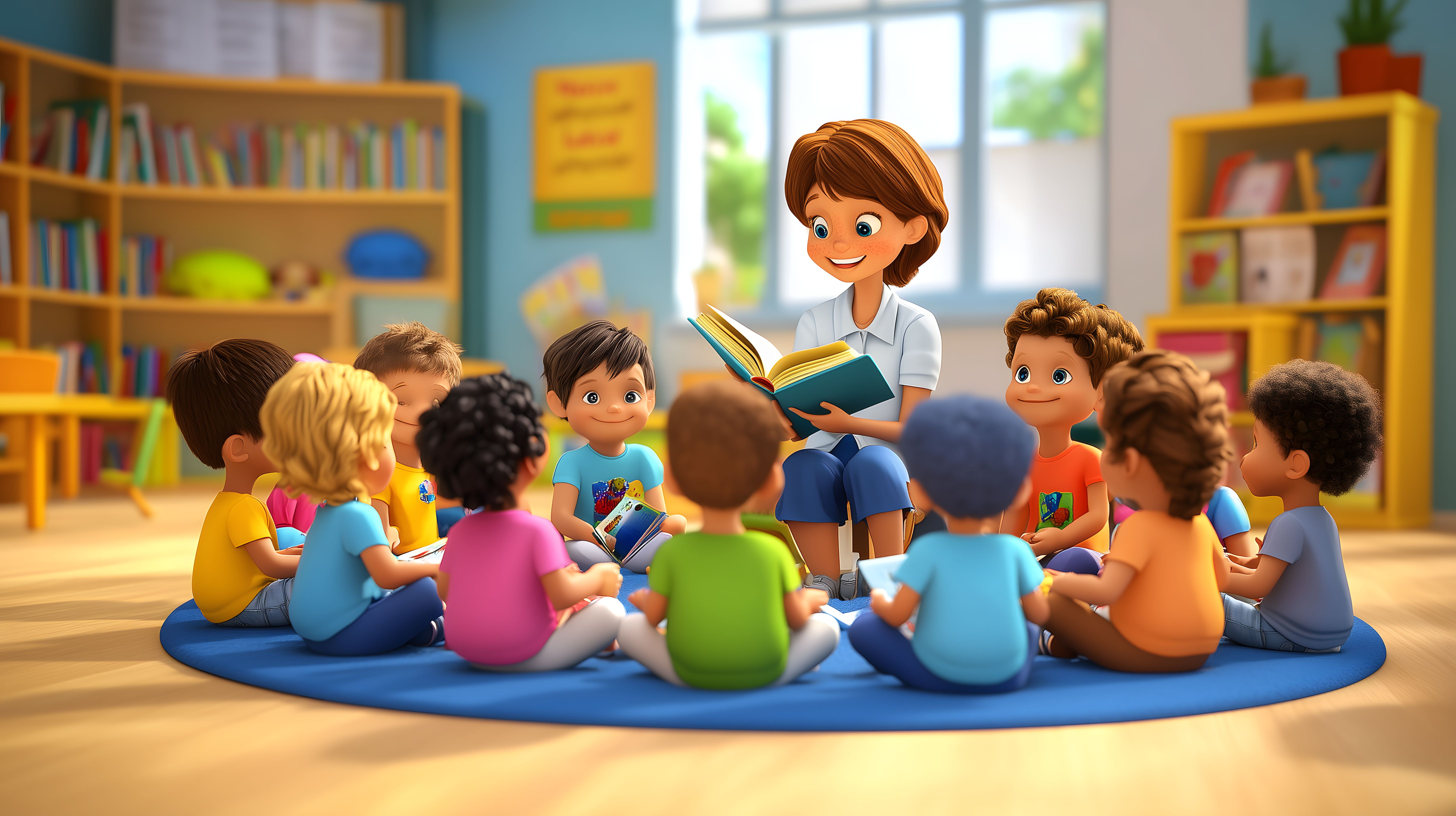 Das Bild zeigt eine fröhliche Szene in einem bunten Klassenzimmer. Eine lächelnde Lehrerin liest einer Gruppe von Kindern eine Geschichte vor. Die Kinder sitzen im Kreis und hören aufmerksam zu. Sie tragen bunte Kleidung und sehen glücklich und interessiert aus. Das Klassenzimmer ist hell und freundlich gestaltet, mit Regalen voller Bücher und bunten Dekorationen. Diese Illustration ist ideal für Inhalte rund um Bildung, Lernen, Lehrer-Schüler-Beziehungen und kindgerechte Aktivitäten. Als kostenloses Stockfoto in hoher Auflösung unter der Creative-Commons-Lizenz kann es vielseitig in Blogs, Newslettern, Social-Media-Beiträgen oder Werbematerial eingesetzt werden.