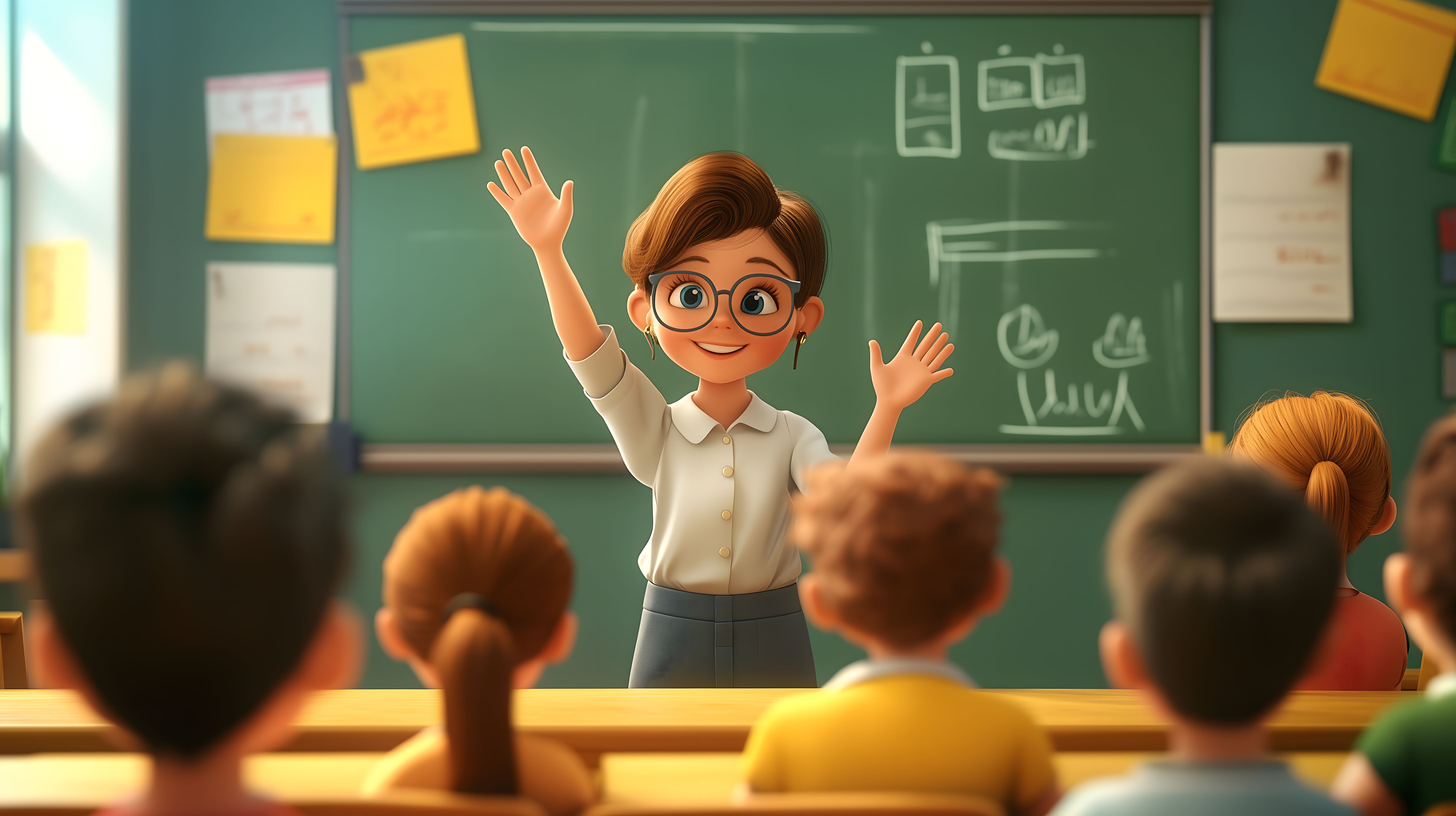 Das Bild zeigt eine engagierte Lehrerin, die ihre Schüler im Klassenzimmer mit erhobenen Händen zu motivieren scheint. Mit einem freundlichen Lächeln und einer aufgeweckten Körpersprache lenkt sie die Aufmerksamkeit ihrer Schüler auf sich, die offenbar gerade einem Unterrichtsgeschehen folgen. Das Klassenzimmer ist modern und farbenfroh gestaltet, mit Tafel, Schülertischen und Pinnwand. Dieses Stockfoto könnte für Webseiten, Blogbeiträge oder soziale Medien rund um Themen wie Bildung, Unterricht oder Pädagogik eingesetzt werden. Es ist in hoher Auflösung verfügbar und unter einer Creative-Commons-Lizenz frei nutzbar.