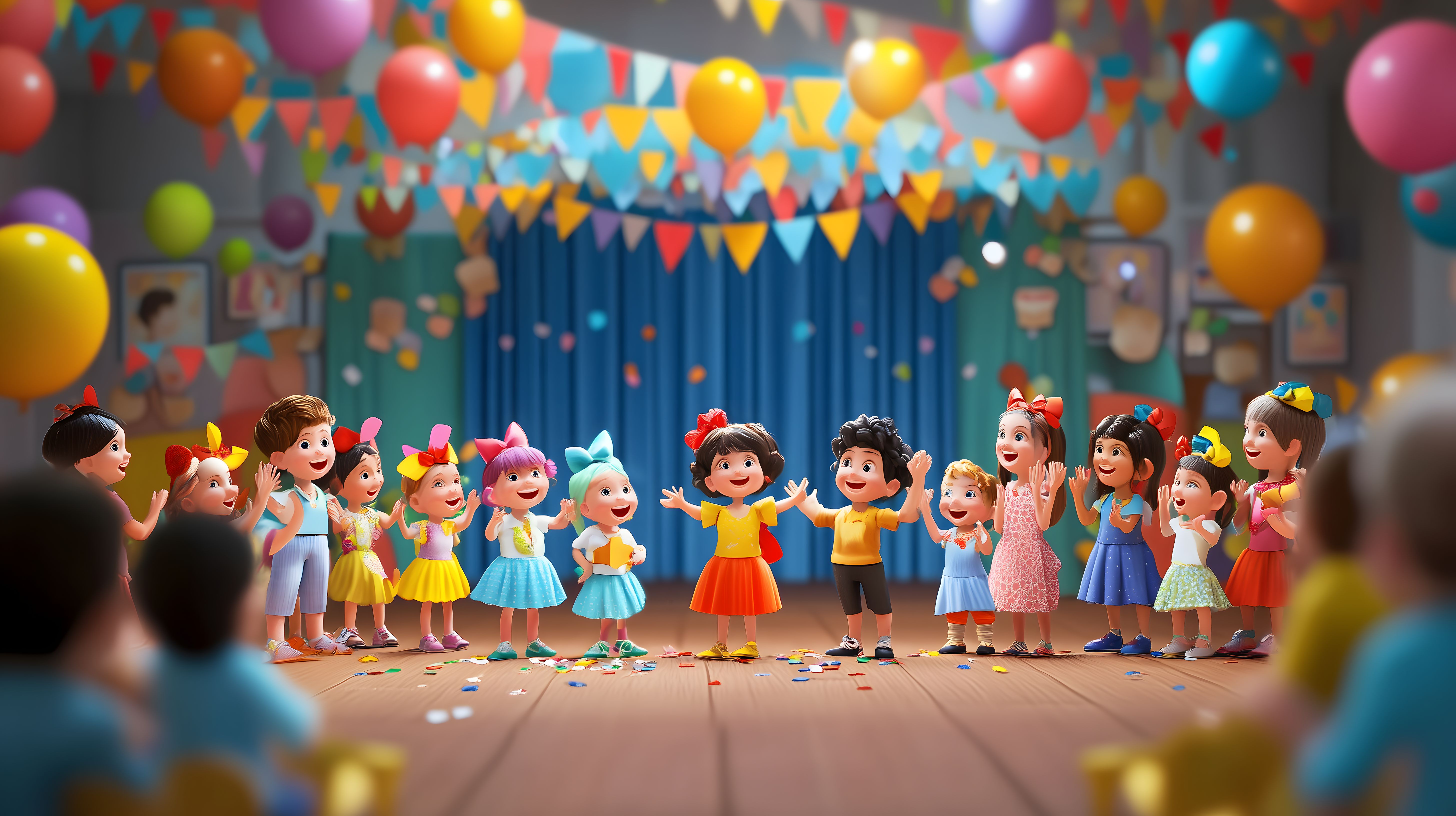 Dieses farbenfrohe Stockfoto zeigt eine bunte Schulfeier mit singenden und tanzenden Kindern auf einer Bühne. Im Hintergrund sind Luftballons, Girlanden und Konfetti zu sehen, die eine festliche Stimmung verbreiten. Die Kinder tragen unterschiedliche Kostüme und Outfits in leuchtenden Farben, was eine lebendige und kreative Atmosphäre schafft. Dieses Bild eignet sich hervorragend für Illustrationen, Werbematerialien oder Projekte rund um Kindheit, Feierlichkeiten und Kreativität. Als hochwertiges Stockfoto in hoher Auflösung steht es unter einer Creative-Commons-Lizenz kostenlos zur Verfügung.