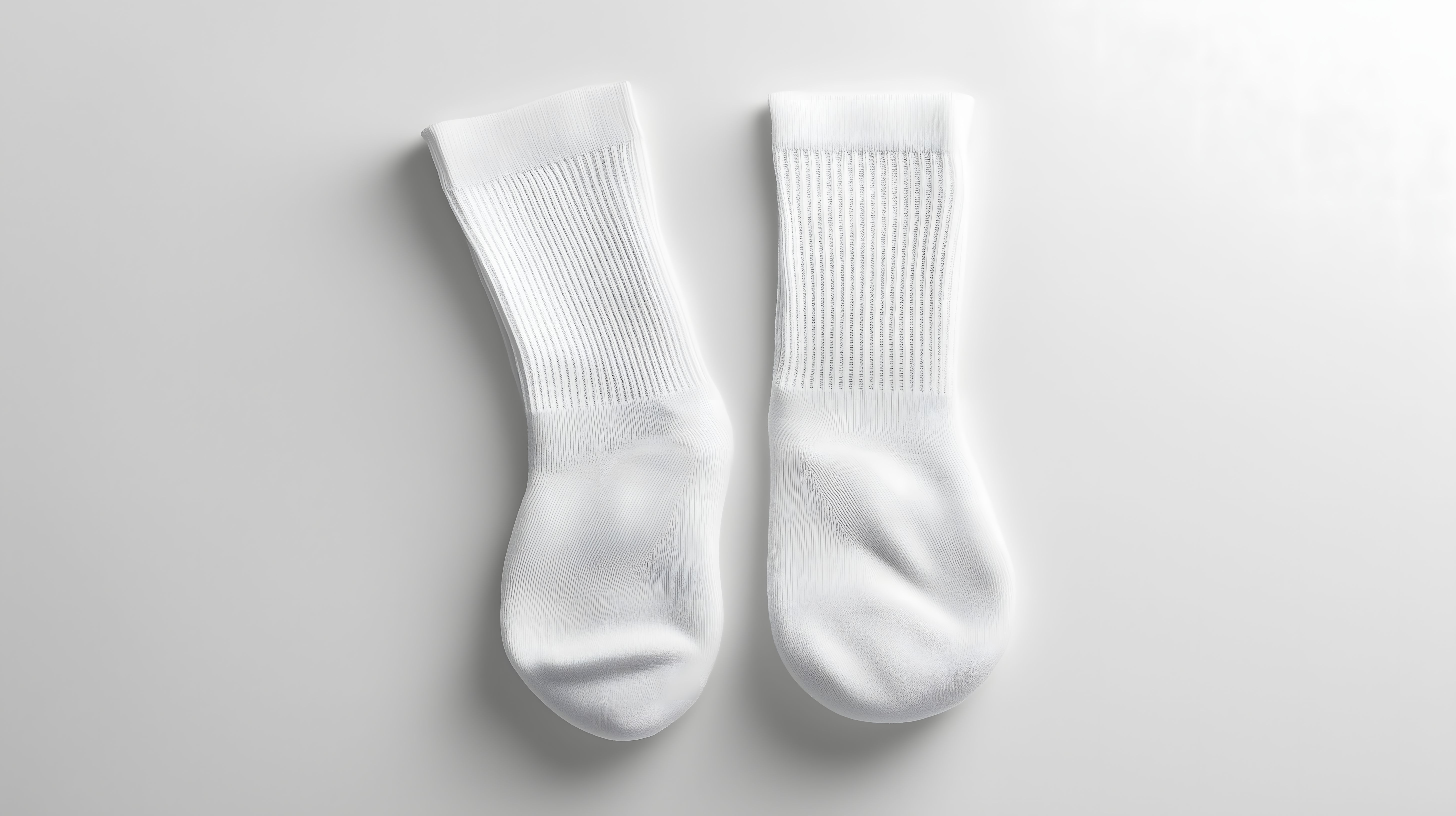 Das Bild zeigt ein Paar frisch gewaschene, weiße Baumwollsocken vor neutralem, weißem Hintergrund. Die Socken sind in Nahaufnahme zu sehen, sodass ihre feine, gestreifte Textur und hohe Qualität deutlich hervortreten. Das minimalistisch gehaltene Motiv strahlt Klarheit, Sauberkeit und Frische aus. Es eignet sich hervorragend als kostenloses Stockfoto für Blog-Beiträge, Newsletter-Designs, Social-Media-Posts oder Werbematerialien rund um das Thema Textilien, Haushalt und Grundausstattung. Das hochauflösende Bild ist unter einer Creative-Commons-Lizenz frei nutzbar.