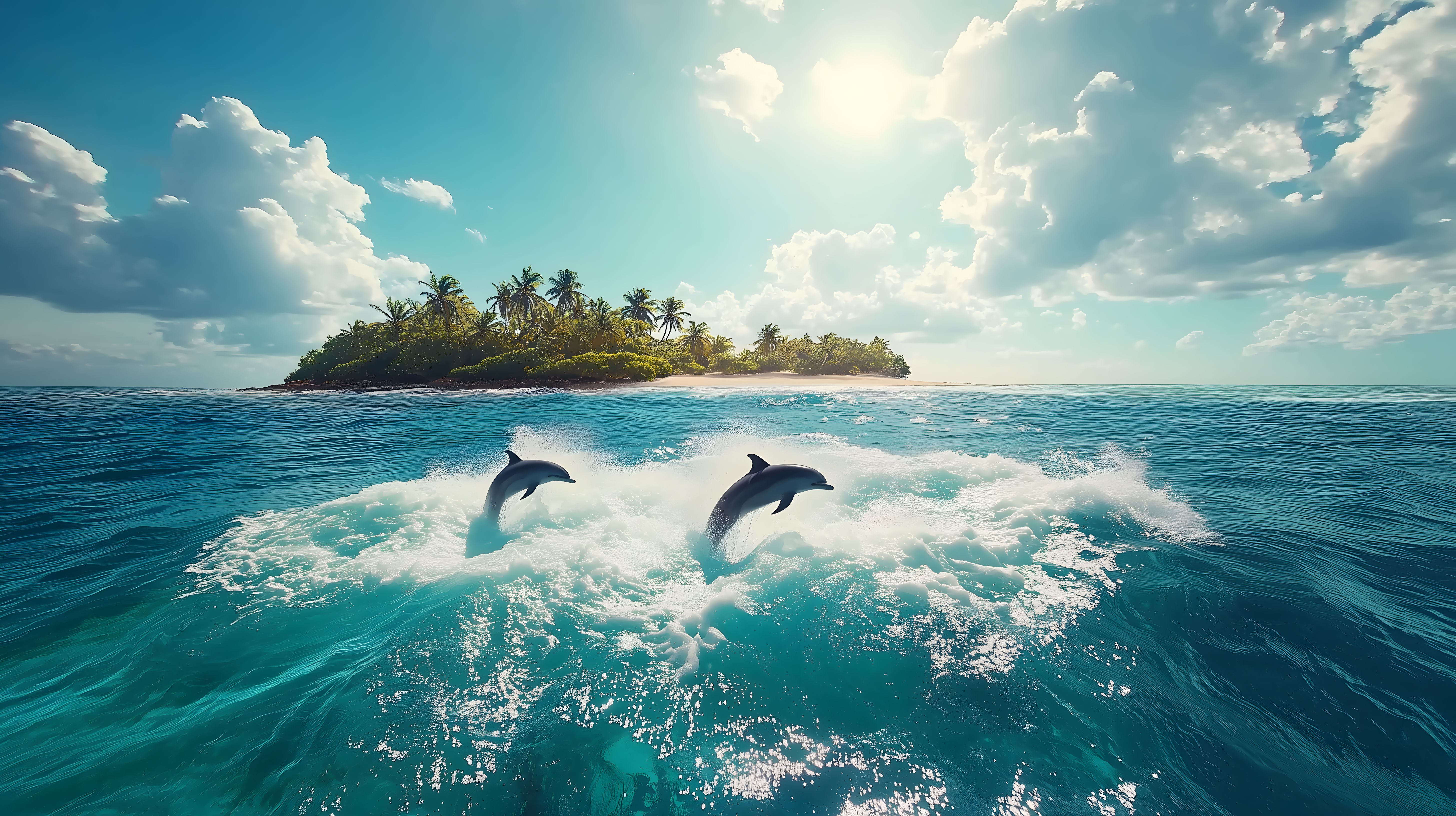 Dieses atemberaubende Foto zeigt eine traumhafte, tropische Insel umgeben von türkisblauem Ozeanwasser. Im Vordergrund sind zwei Delfine zu sehen, die elegant aus den Wellen springen. Im Hintergrund ist eine dichte Palmenwaldkulisse zu erkennen, die von strahlend blauem Himmel und Wolken überspannt wird. Das Bild strahlt Freiheit, Abenteuer und pure Entspannung aus - perfekt als Fotokulisse für Reiseblogs, Social-Media-Posts oder Werbematerial. Dieses hochauflösende, kostenlose Stockfoto steht unter der Creative-Commons-Lizenz zur Verfügung.