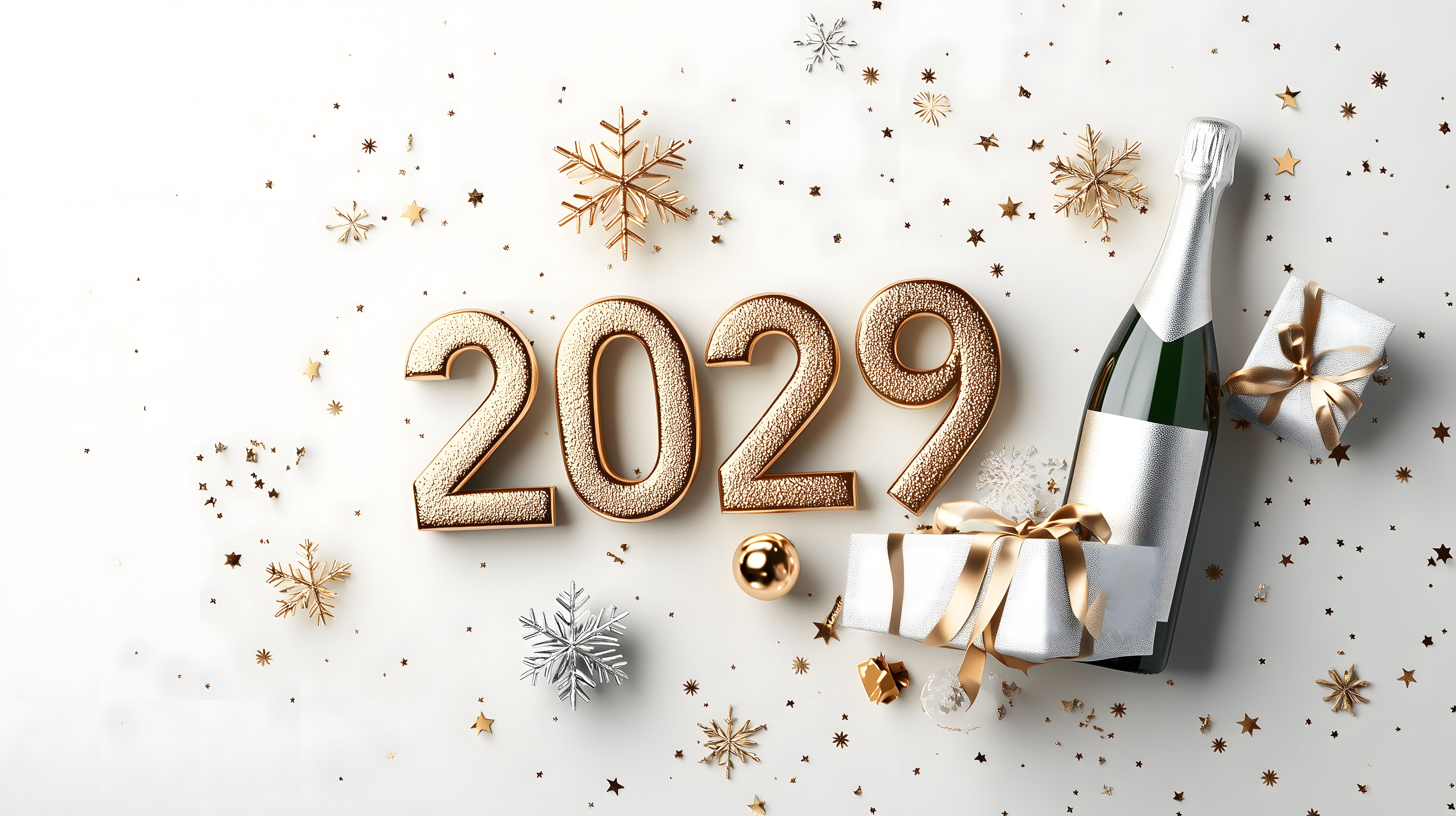 Dieses glitzernde Neujahrs-Stilleben zeigt die Jahreszahl 2029 in goldfarbener Optik umrahmt von funkelnden Schneeflocken, Sternen und einer Flasche Champagner. Die festliche Komposition in Weiß, Gold und Silber strahlt eine feierliche und glamouröse Stimmung aus. Das hochauflösende Foto eignet sich hervorragend als kostenloses Stockfoto für Blogs, Newsletter, Social-Media-Beiträge und Werbeanzeigen rund um Silvester und Neujahr. Die Creative-Commons-Lizenz ermöglicht eine flexible Nutzung für private und kommerzielle Zwecke.