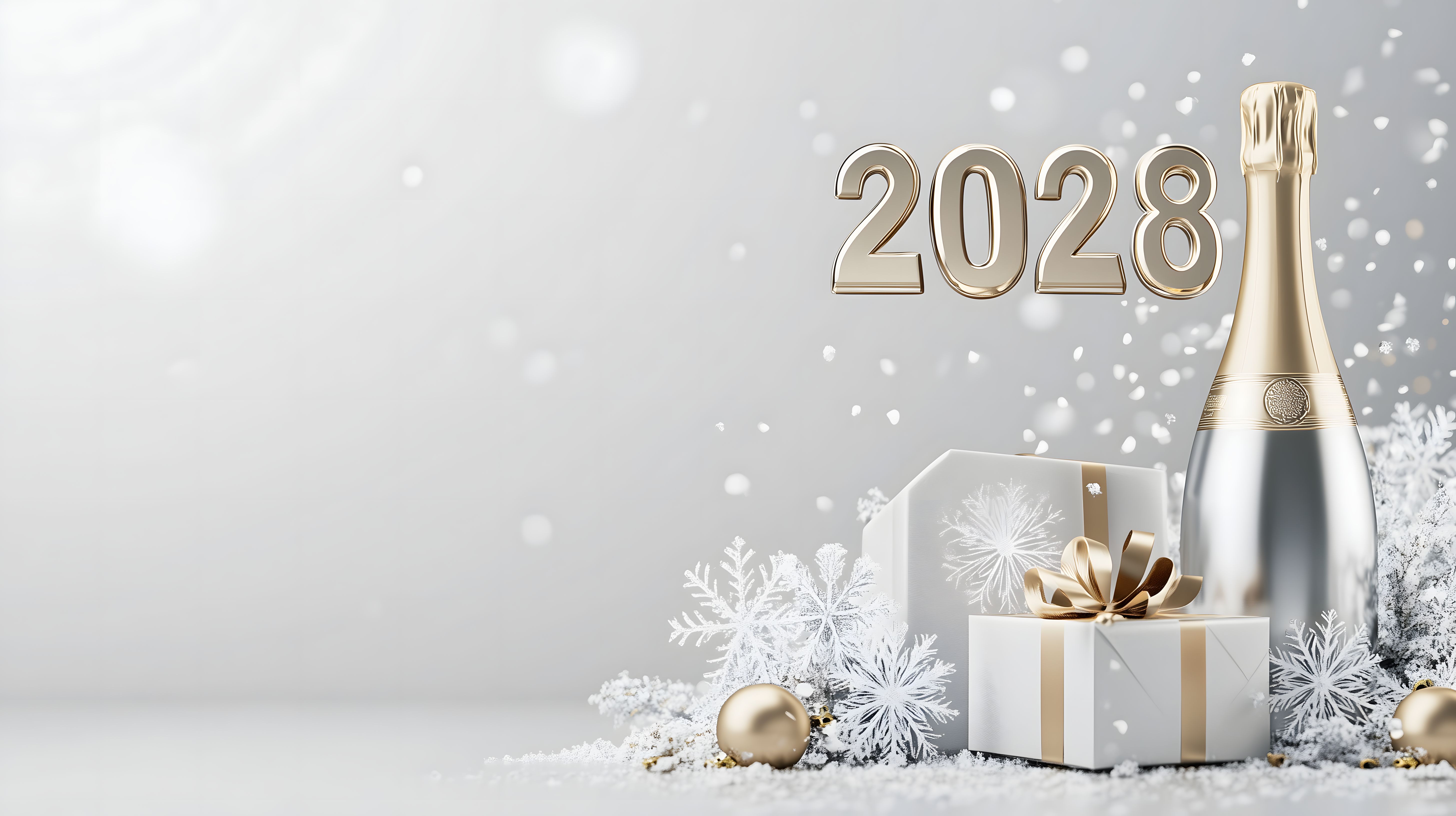 Dieses wintreliche Stockfoto zeigt eine elegante Neujahrsszene mit den Zahlen 2028 in goldfarbener Optik. Im Vordergrund steht eine Flasche Champagner, umgeben von Geschenkboxen in Silber und Gold. Im Hintergrund sind verschwommene Schneeflocken zu sehen, die eine festliche Stimmung erzeugen. Das Bild bietet sich hervorragend für Neujahrskarten, Social-Media-Posts oder Werbedesign für das Jahr 2028 an. Das hochauflösende Foto steht unter einer Creative-Commons-Lizenz kostenlos zum Download zur Verfügung.