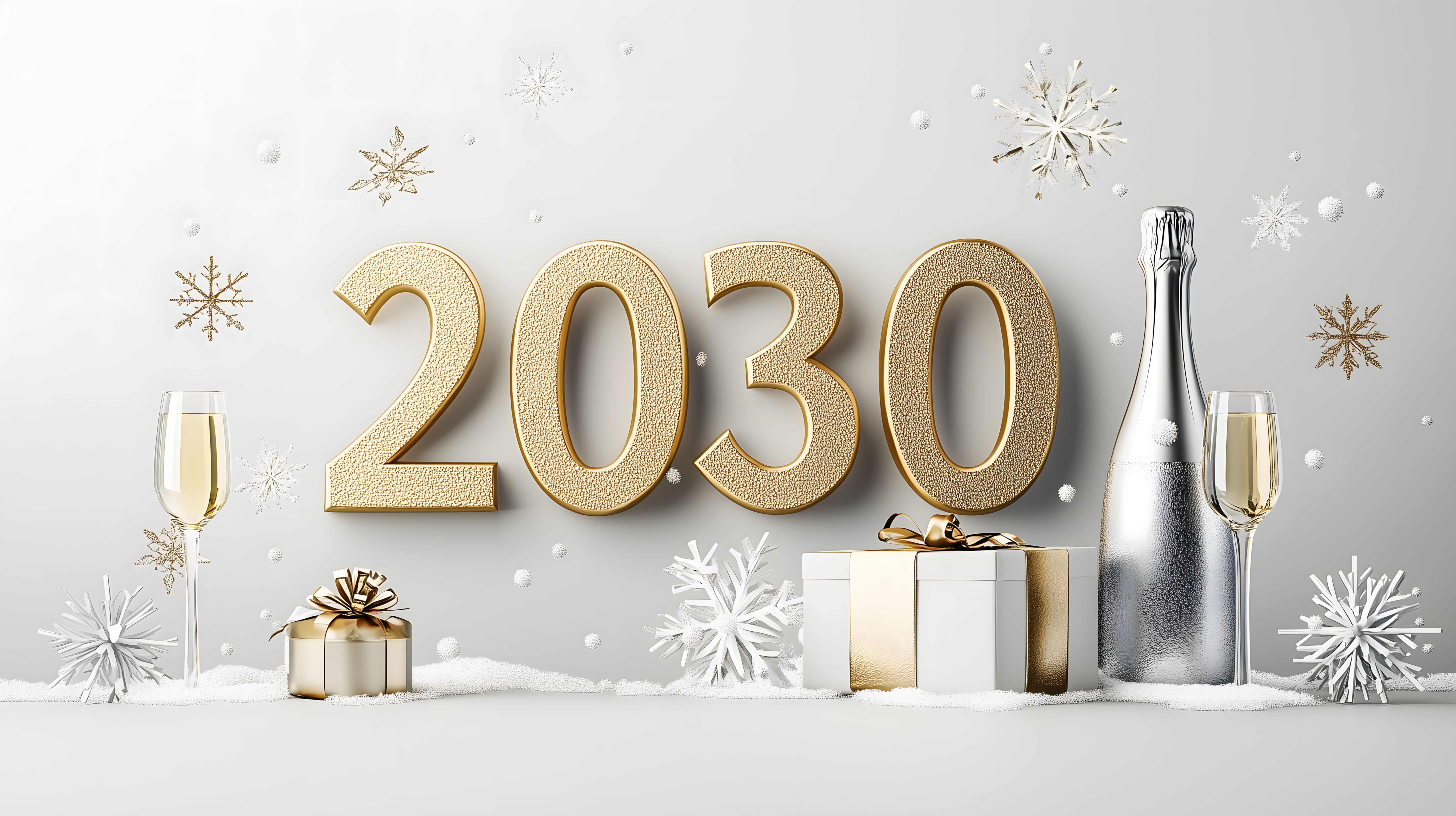Dieses stimmungsvolle Foto zeigt eine festliche Neujahrsdekorationen mit glitzernden goldenen Ziffern '2030', umgeben von Schneeflocken, Geschenkboxen, Champagnerflaschen und -gläsern. Die elegante Silber-Goldfarb-Kombination verleiht dem Bild einen luxuriösen, glamourösen Charakter. Es eignet sich hervorragend für die Verwendung in Blogs, Newslettern, Social-Media-Beiträgen oder Werbematerialien rund um Neujahr, Weihnachten und die Feiertagssaison. Als hochauflösendes, kostenloses Stockfoto unter einer Creative-Commons-Lizenz ist es frei für vielfältige Einsatzzwecke nutzbar.