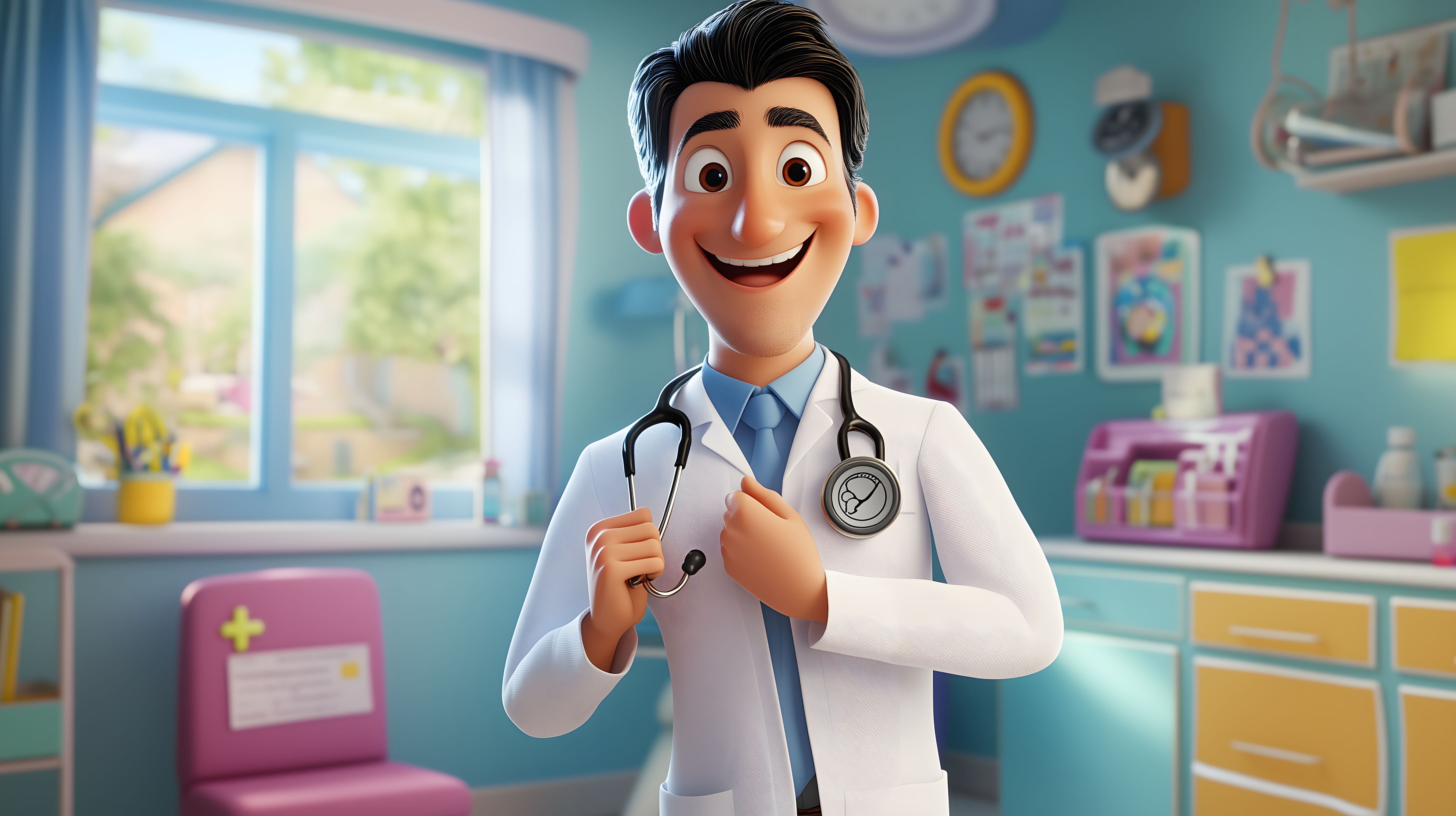 Das Bild zeigt einen fröhlichen Arzt in einer modernen, kindgerechten Praxis. Der Protagonist steht in einem hellen, freundlichen Raum, der mit Wanddekorationen und Spielsachen ausgestattet ist. Er trägt einen weißen Arztkittel und ein Stethoskop und blickt mit einem warmen Lächeln in Richtung Betrachter. Das Bild vermittelt einen positiven, vertrauensvollen Eindruck und könnte für Werbe- oder Blogbeiträge rund um das Thema Gesundheitswesen, Kinderarzt oder Familienmedizin geeignet sein. Das hochauflösende, kostenlose Stockfoto steht unter einer Creative-Commons-Lizenz zur Verfügung.