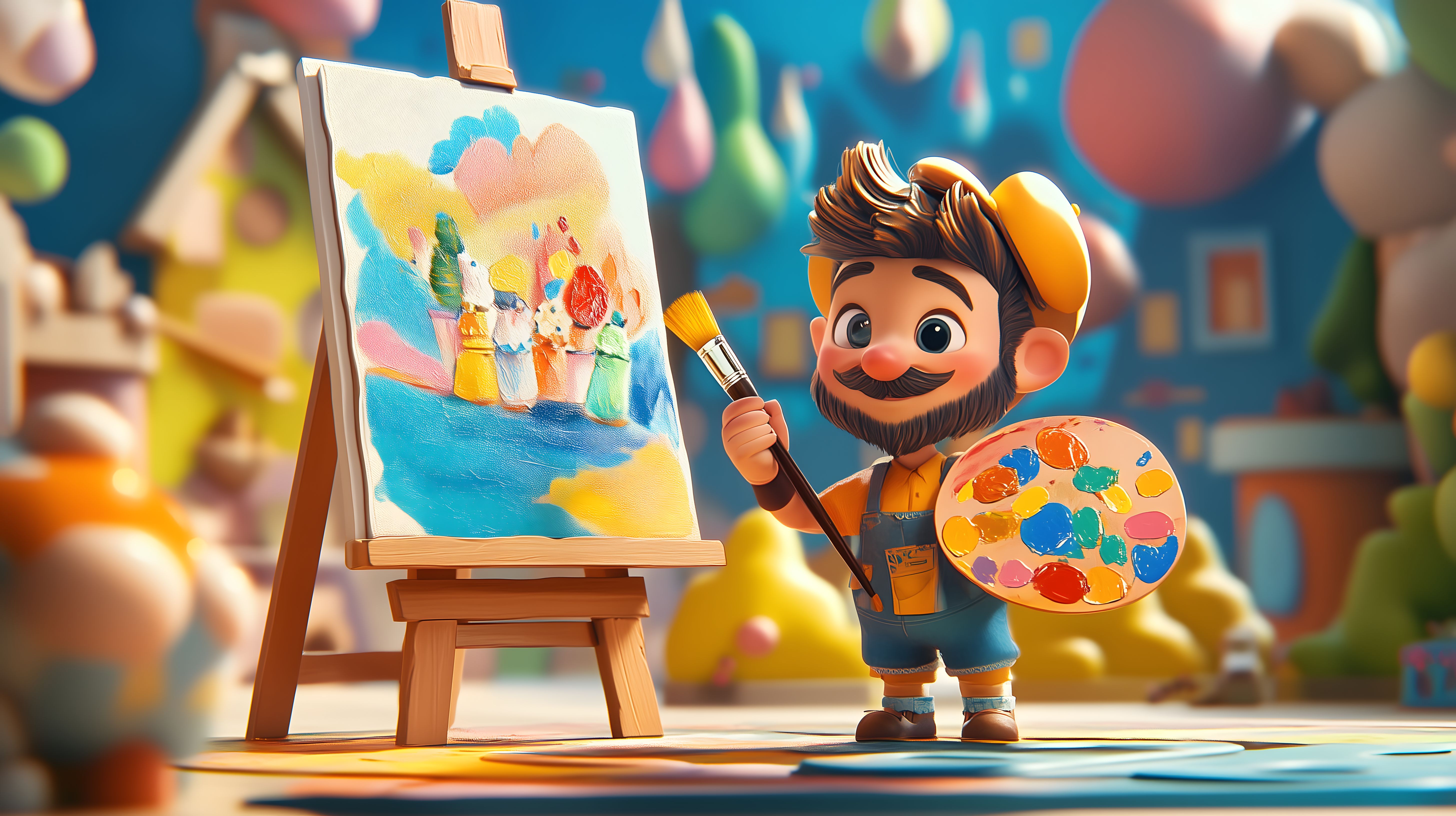 Das Bild zeigt einen fröhlichen, bärtigen Künstler, der vor einer Staffelei in einer farbenfrohen, imaginären Umgebung steht. Er hält eine Farbpalette und einen Pinsel in den Händen, als würde er gerade ein Gemälde erschaffen. Der Hintergrund ist mit bunten, abstrakten Formen und Formen gefüllt, die eine kreative, verspielt-illustrative Stimmung vermitteln.