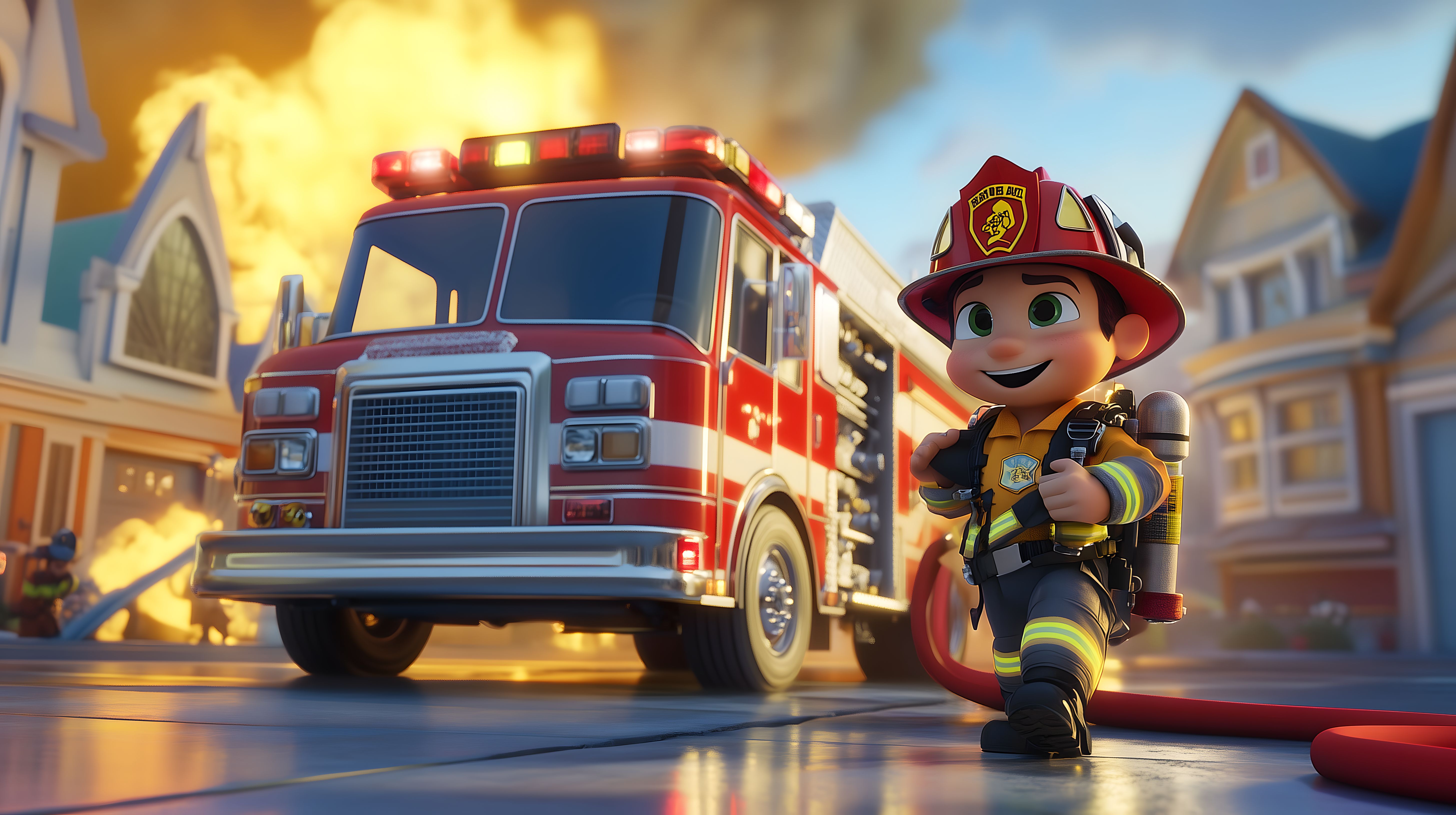 Das Foto zeigt einen Cartoon-Feuerwehrmann in voller Montur, der mit seinem Löschschlauch vor einem brennenden Gebäude steht. Im Hintergrund ist ein Feuerwehrfahrzeug mit Blaulicht zu sehen, während Rauch und Flammen aus dem Haus schlagen. Das Bild vermittelt eine dynamische und actionreiche Szene eines Feuerwehreinsatzes in einem urbanen Umfeld.