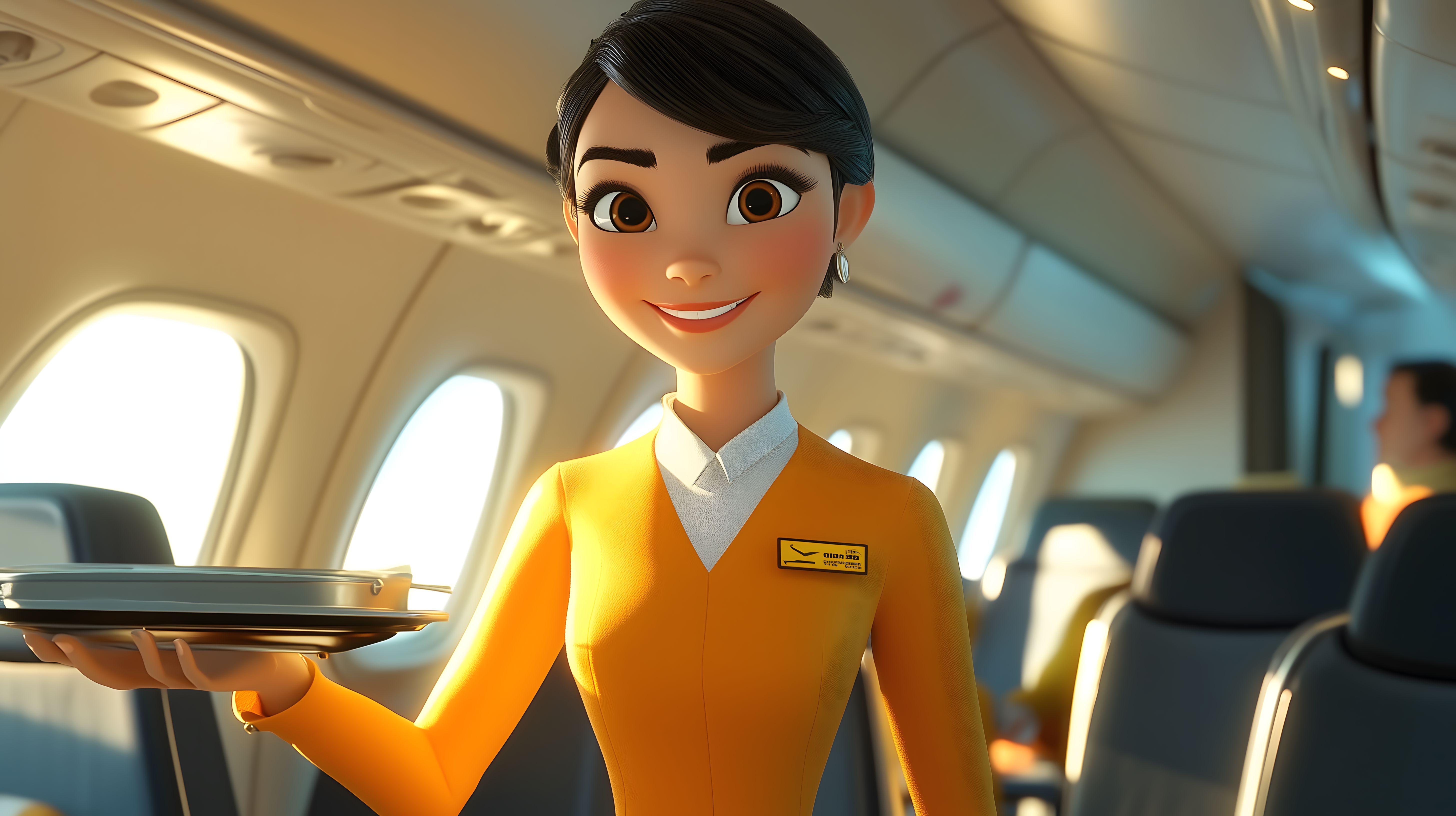 Das Bild zeigt eine freundlich lächelnde Flugbegleiterin in einem sonnendurchfluteten Flugzeug-Interieur. Sie trägt einen gelben Anzug und hält ein Tablett mit Getränken in der Hand, bereit, die Passagiere zu bedienen. Das Foto vermittelt ein positives Bild des Service und der Professionalität einer Fluggesellschaft und eignet sich gut für den Einsatz in Reiseportalen, Blogbeiträgen oder Werbematerialien rund um das Thema Fliegen. Als hochauflösendes, kostenloses Stockfoto unter Creative-Commons-Lizenz kann es frei für verschiedenste Zwecke genutzt werden.