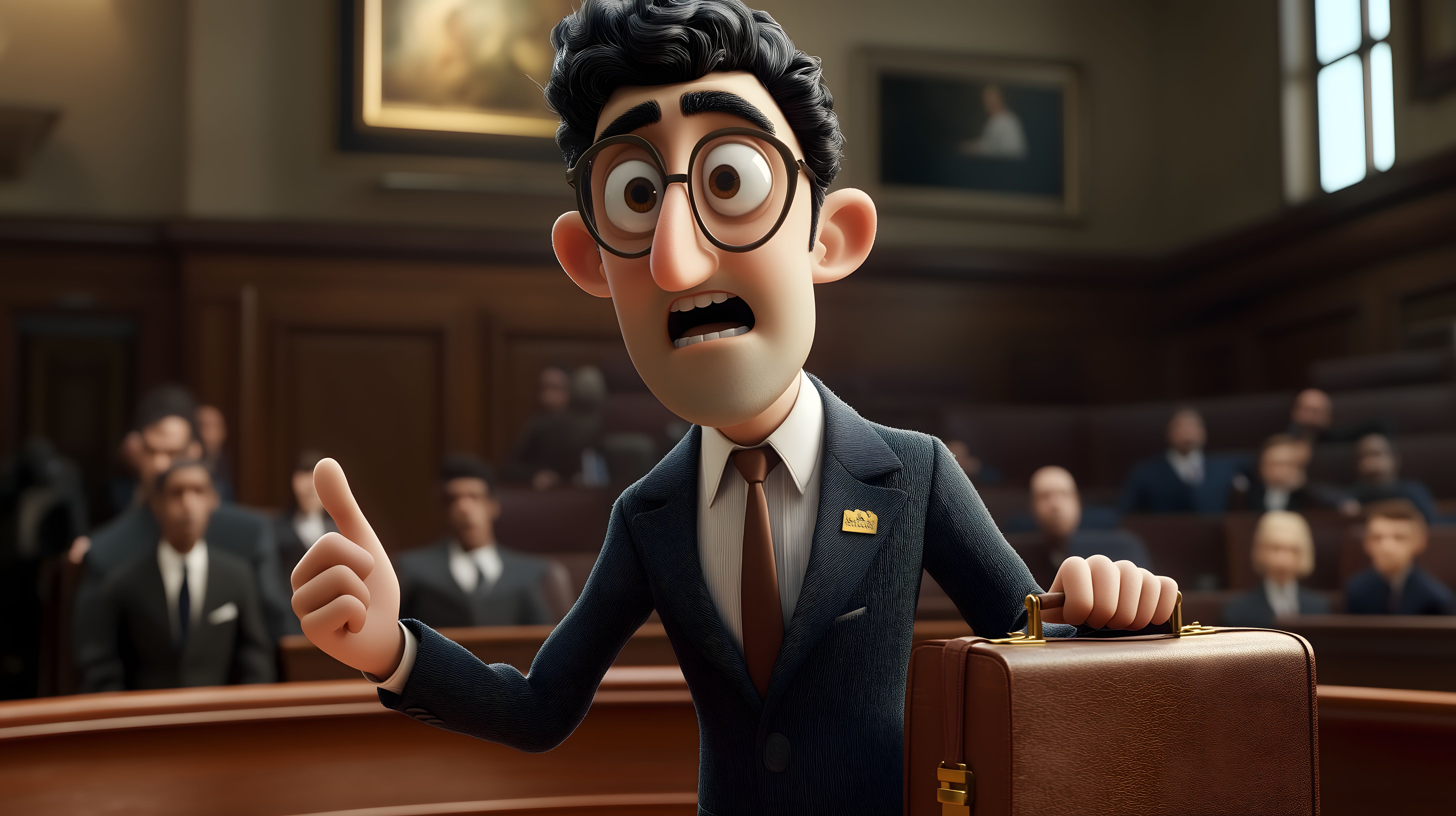 Das Bild zeigt einen aufgeregten, animierten Geschäftsmann in einem Gerichtssaal. Er trägt einen dunklen Anzug und Krawatte und hält einen Aktenkoffer in der Hand. Mit weit aufgerissenen Augen und erhobenen Zeigefinger scheint er mitten in einer Aussage zu sein. Der Hintergrund ist detailliert gestaltet mit holzgetäfelten Wänden, Gemälden und anderen Anwälten im Saal. Das Foto vermittelt eine dynamische, dramatische Szene und wäre ideal für Illustrationen, Grafiken oder Artikel rund um Rechtsthemen, Gerichtsverhandlungen oder Anwaltskanzleien. Als kostenloses Stockfoto in hoher Auflösung und unter Creative-Commons-Lizenz können Nutzer das Bild frei verwenden.