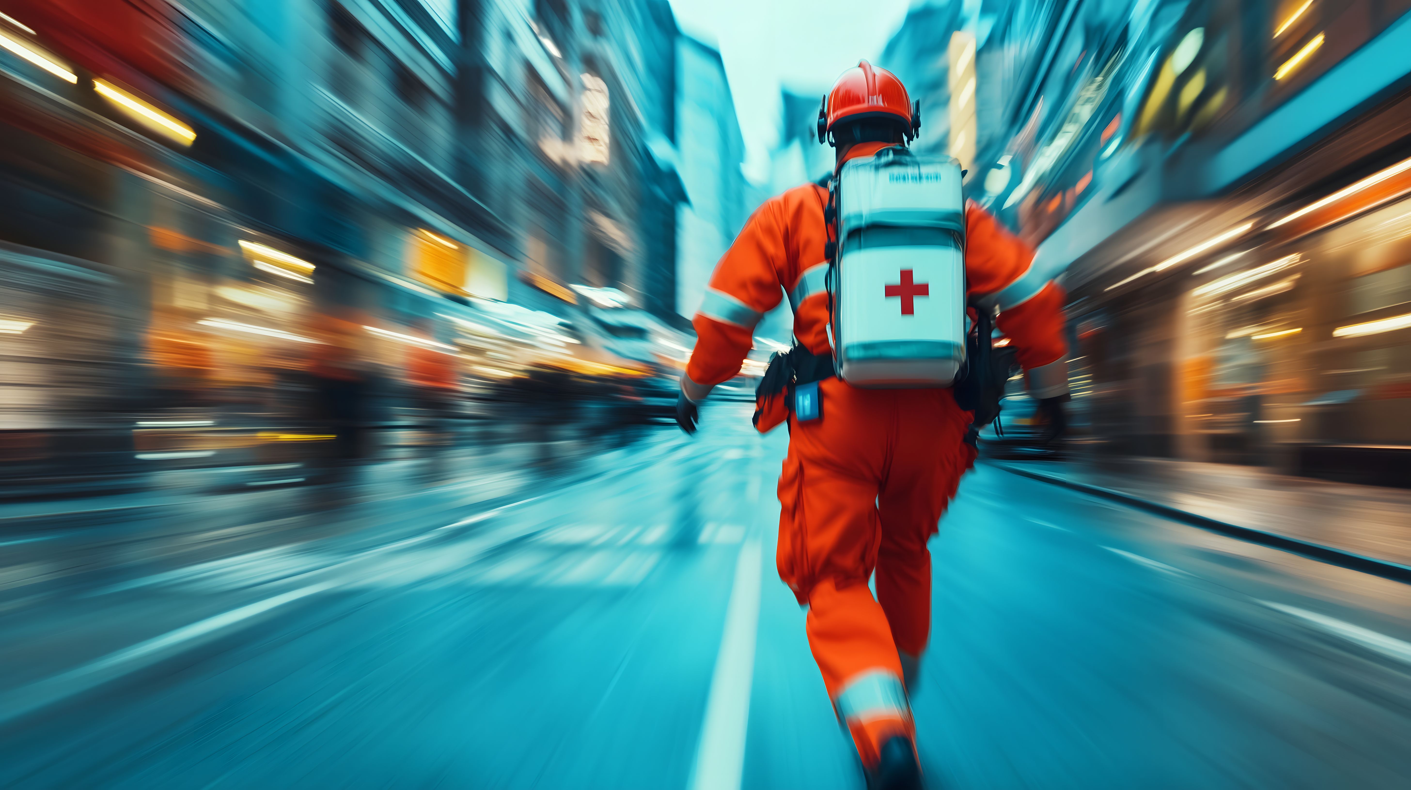 Das Bild zeigt einen Sanitäter, der mit voller Ausrüstung und Eile durch eine Großstadt eilt. Der Rettungshelfer trägt eine orangefarbene Uniform und einen Rucksack mit dem Roten-Kreuz-Symbol, während er sich in einer verschwommenen, schnellen Bewegung durch die Straßen bewegt. Die Szenerie ist von intensiven Blautönen und Bewegungsunschärfe geprägt, was einen Eindruck von Dringlichkeit und Dynamik vermittelt. Dieses Stockfoto eignet sich hervorragend für Beiträge in Blogs, Newslettern oder Social-Media-Kanälen rund um Rettungsdienste, Notfallmedizin oder Katastrophenhilfe. Es ist in hoher Auflösung verfügbar und kann unter den Bedingungen der Creative Commons-Lizenz kostenfrei genutzt werden.