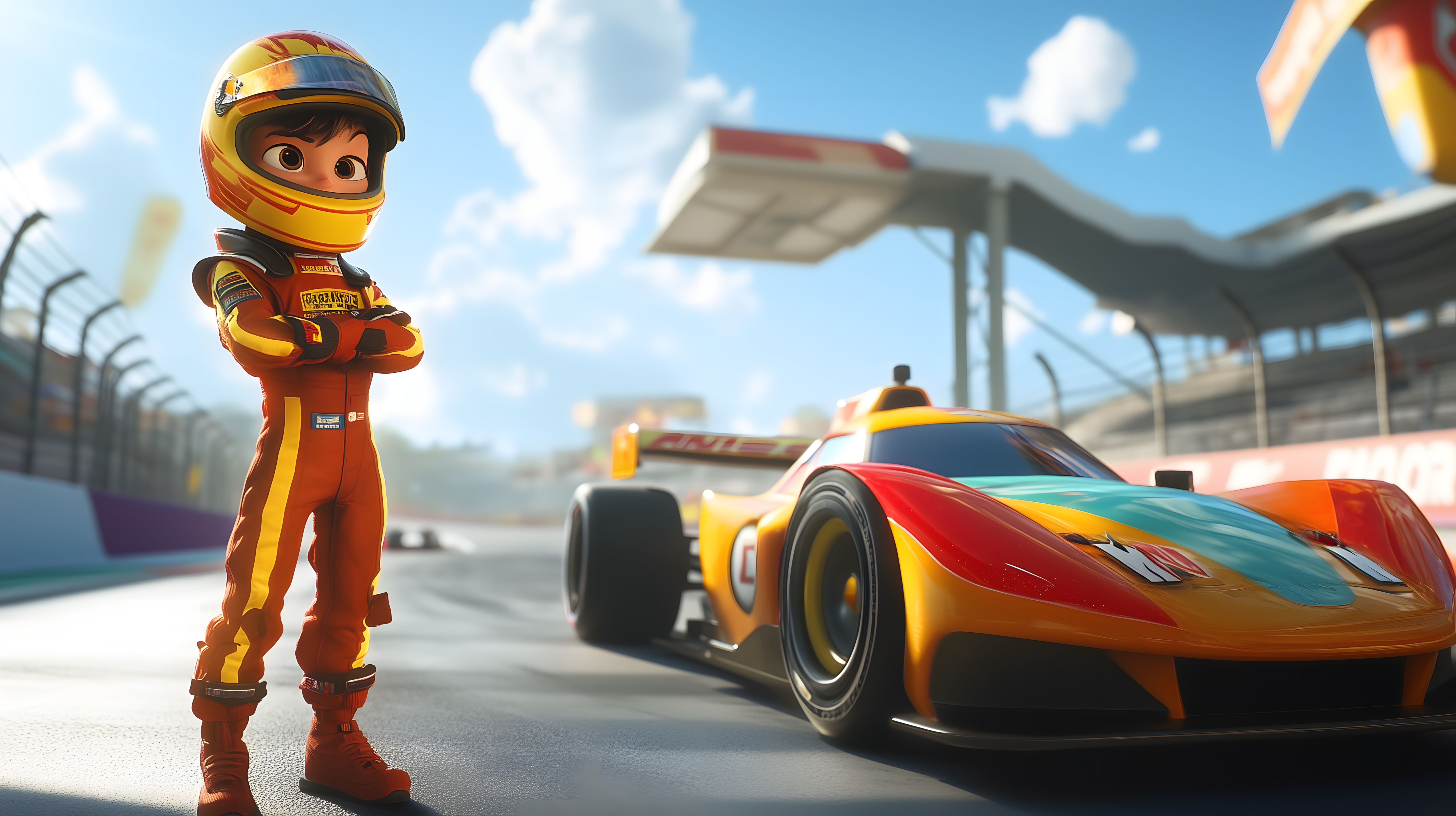 Das Bild zeigt einen Rennfahrer in voller Montur, der neben einem bunten und modernen Rennwagen auf einer Rennstrecke steht. Der Fahrer ist in einem Cartoon-Stil dargestellt und hat eine große Schutzausrüstung an, die ihm einen futuristischen Look verleiht. Der Rennwagen im Hintergrund ist ebenfalls sehr farbenfroh und dynamisch gestaltet, was den Eindruck von hoher Geschwindigkeit und Action vermittelt. Dieses Stockfoto eignet sich hervorragend für Blogbeiträge, Newsletter oder Social-Media-Posts rund um Motorsport, Rennen oder das Thema Geschwindigkeit. Es ist in hoher Auflösung verfügbar und unter einer Creative-Commons-Lizenz lizenziert.