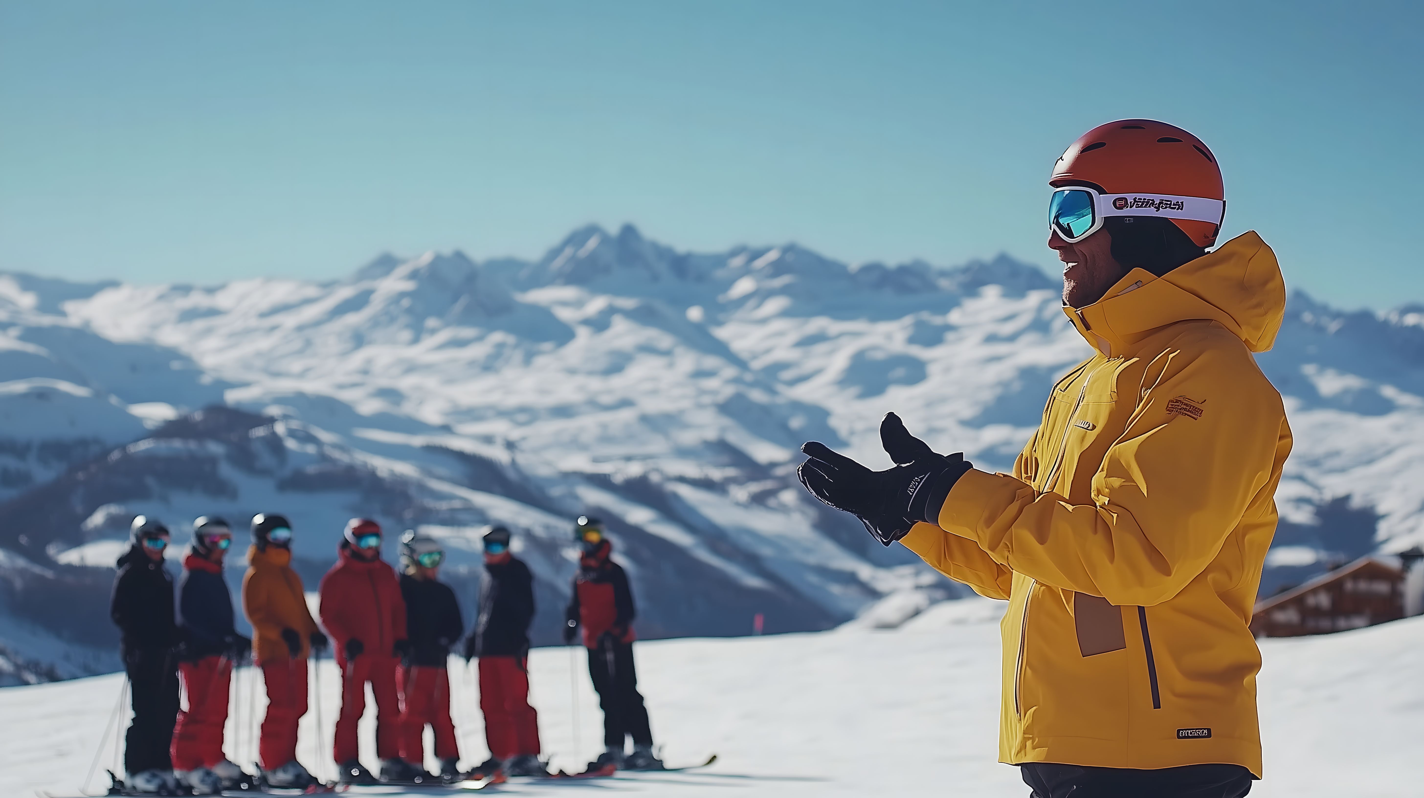 Dieses Foto zeigt eine Gruppe von Skifahrern in gelben und roten Jacken, angeführt von einem Skiinstruktor in einer gelben Jacke. Sie stehen auf einer Bergspitze mit einer atemberaubenden Aussicht auf schneebedeckte Gipfel im Hintergrund. Die Komposition und die Farbpalette machen dieses Foto zu einem hervorragenden Bild für die Verwendung in Blogs, Newslettern, Social-Media-Posts oder als Werbefoto für Winterurlaube und Outdoor-Aktivitäten. Das hochauflösende Stockfoto ist unter einer Creative-Commons-Lizenz verfügbar und kann kostenlos für verschiedene kommerzielle und private Zwecke genutzt werden.