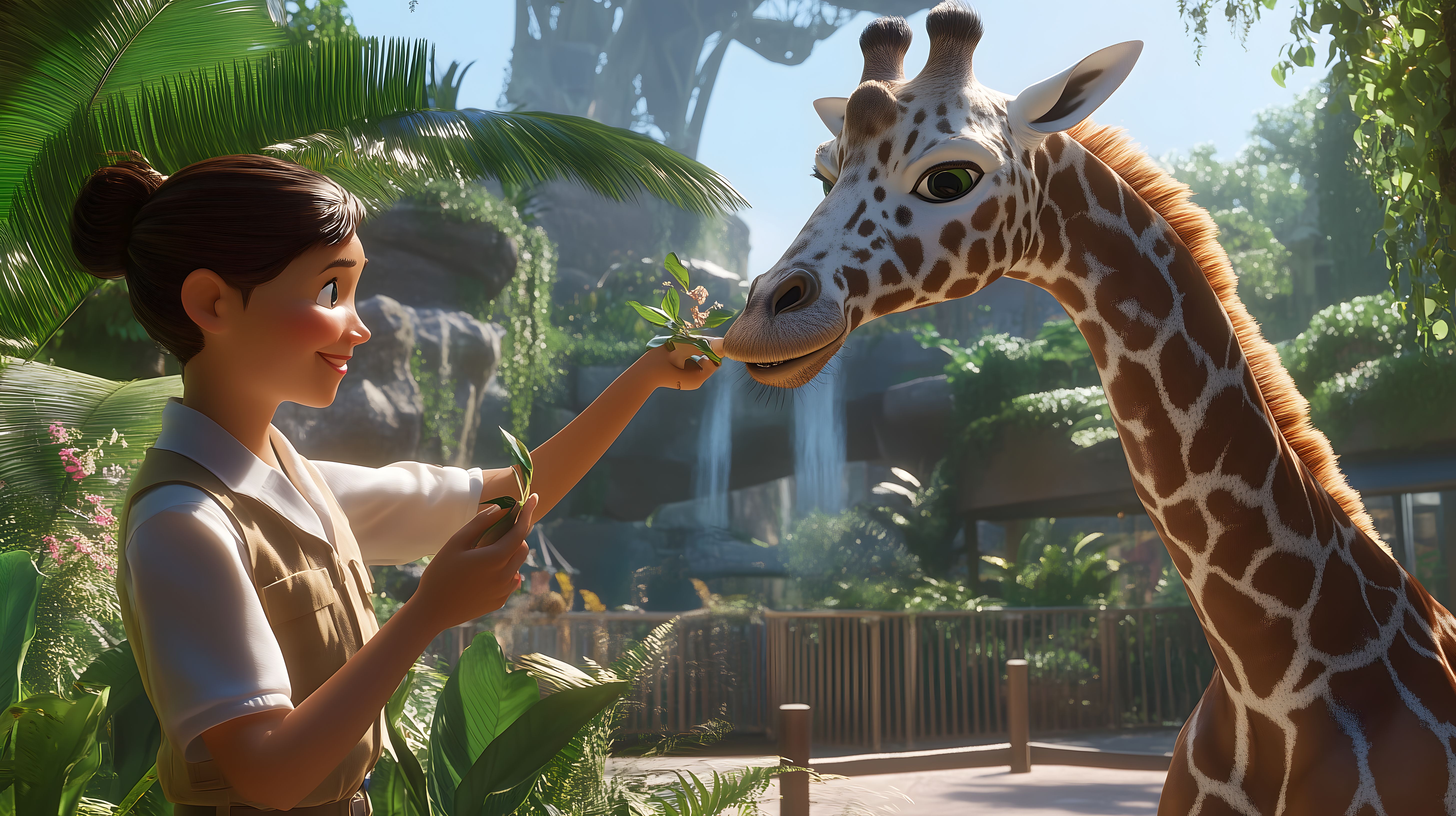 Dieses fotorealistische Stockfoto zeigt eine Tierpflegerin, die eine Giraffe in einer tropischen Zooumgebung füttert. Die Szenerie ist von üppiger, grüner Vegetation geprägt, mit Palmen und anderen Pflanzen im Hintergrund. Die Giraffe streckt ihren Hals der Pflegerin entgegen, um das Futter aus ihrer Hand entgegenzunehmen. Der Ausdruck auf dem Gesicht der Pflegerin spiegelt Freude und Zufriedenheit wider. Das Bild vermittelt eine friedliche und harmonische Begegnung zwischen Mensch und Tier und eignet sich hervorragend für den Einsatz in Artikeln, Blogs oder sozialen Medien rund um Tierwohl, Naturschutz und nachhaltigen Tourismus. Das hochauflösende Foto steht unter einer Creative-Commons-Lizenz zur kostenlosen Verwendung zur Verfügung.