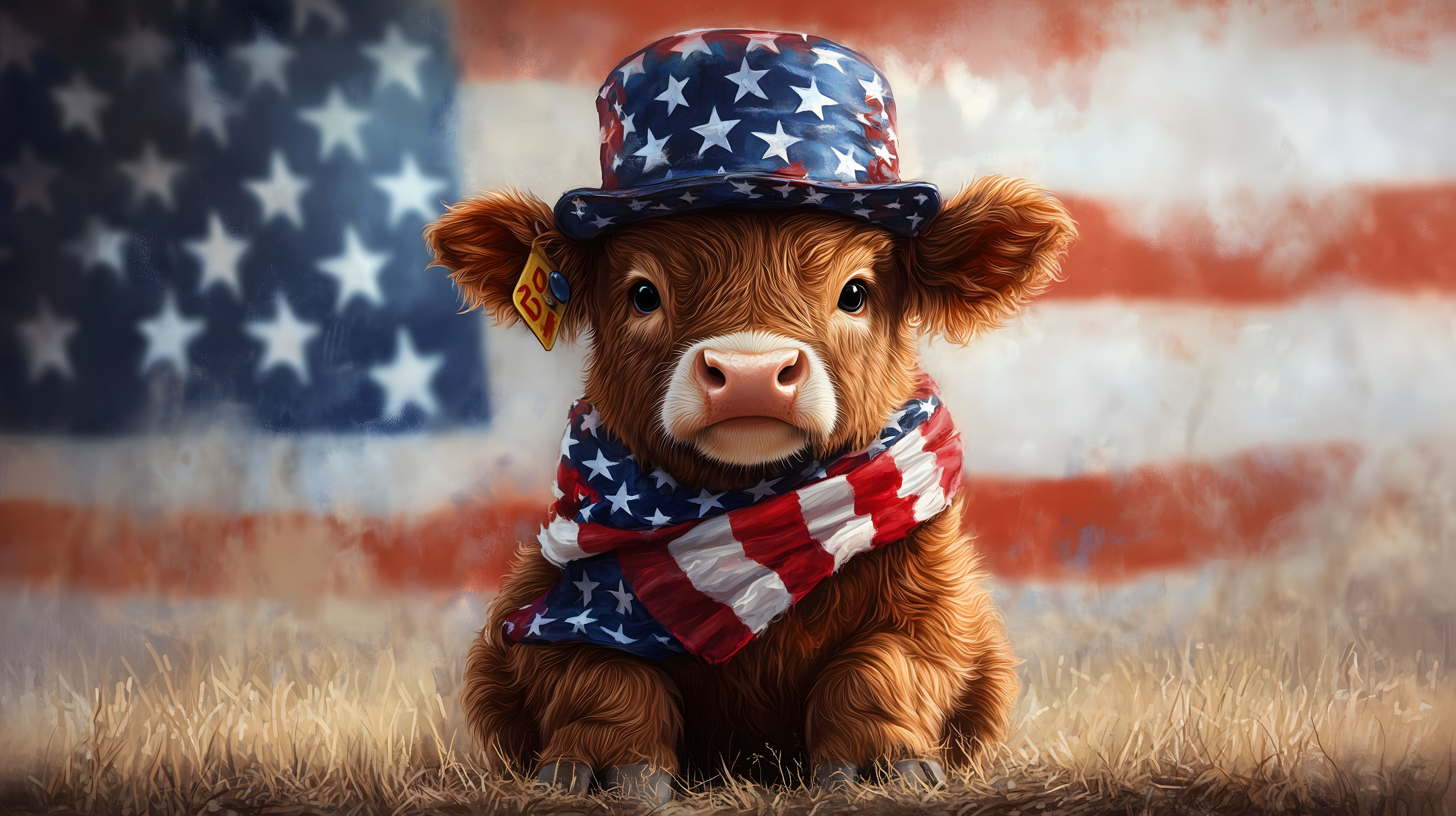 Das Bild zeigt ein Rind in patriotischer Aufmachung vor einem Hintergrund der amerikanischen Flagge. Das Tier trägt einen sternenbeverzierten Hut und einen rot-weiß-blauen Schal, wodurch es sehr amerikanisch anmutet. Die Komposition platziert das Rind im Fokus der Aufnahme, umgeben von einem Grasfeld und vor einem Himmel mit dramatischen Wolkenformationen. Dieses Stockfoto eignet sich hervorragend für Projekte rund um Nationalstolz, Landwirtschaft oder Patriotismus und ist in hoher Auflösung und unter der Creative-Commons-Lizenz kostenlos verfügbar.