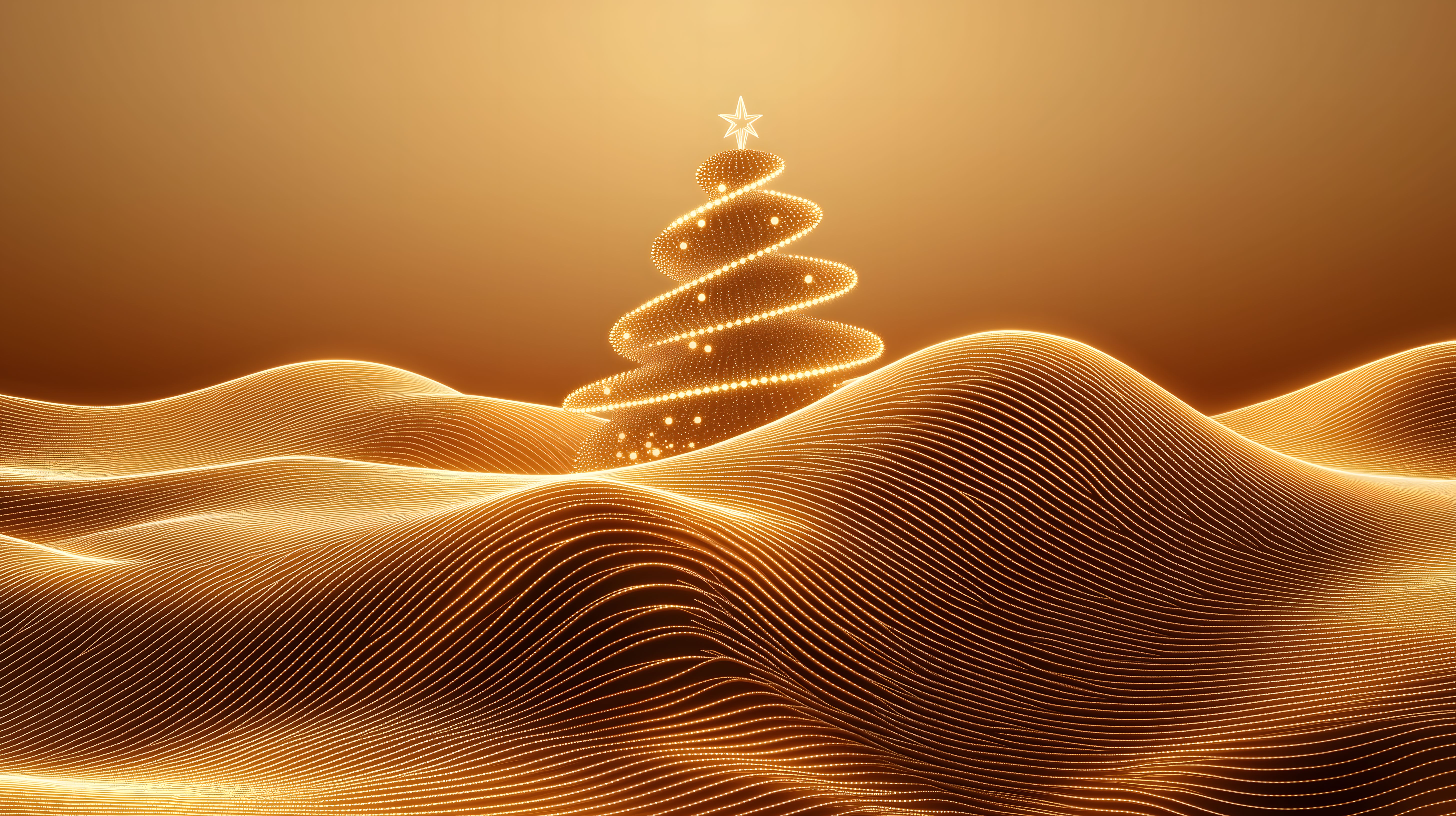 Dieses stimmungsvolle Foto zeigt einen minimalistischen, goldenen Weihnachtsbaum vor einem Hintergrund aus wellenförmigen, goldenen Linien. Der Baum ist aus einer Vielzahl von leuchtenden Punkten zusammengesetzt, die eine lebendige und festliche Atmosphäre erzeugen. Das Bild ist in warmen, goldenen Tönen gehalten und vermittelt ein Gefühl von Wärme und Gemütlichkeit. Es eignet sich perfekt als Hintergrund oder Akzent für Weihnachtsgrüße, Werbekampagnen oder Dekorationen in den Feiertagen. Das hochauflösende Foto steht unter der Creative-Commons-Lizenz und kann daher frei und kostenfrei verwendet werden.